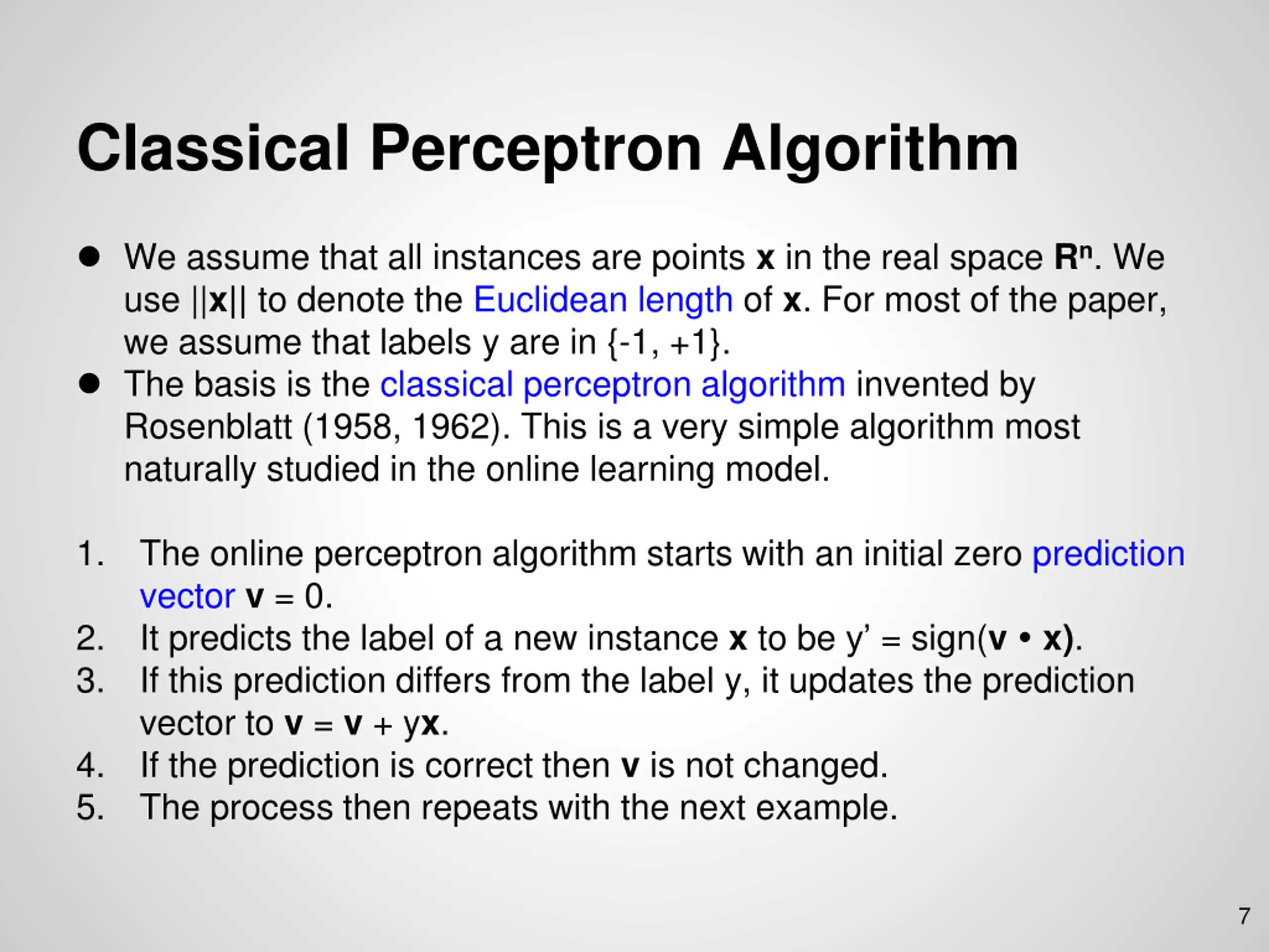 Classical Perceptron Algorithm We assume that all instances are points x in the real space Rn. We use ||x|| to denote the Euclidean length of x. For most of the paper, we assume that labels y are in {-1, +1}. The basis is the classical perceptron algorithm invented by Rosenblatt (1958, 1962). This is a very simple algorithm most naturally studied in the online learning model. 1. The online perceptron algorithm starts with an initial zero prediction vector v = 0. It predicts the label of a new instance x to be y = sign(v x). If this prediction differs from the label y, it updates the prediction vector to v = v + yx. If the prediction is correct then v is not changed. The process then repeats with the next example. 2. 3. 4. 5. 7