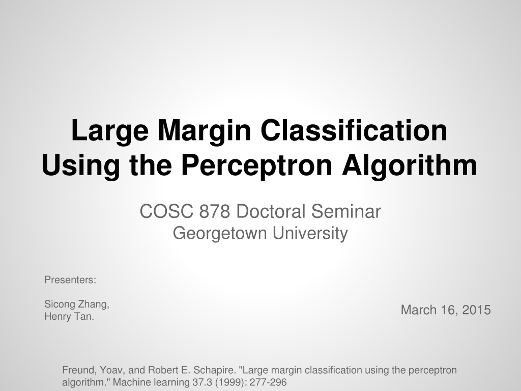 Large Margin Classification Using the Perceptron Algorithm COSC 878 Doctoral Seminar Georgetown University Presenters: Sicong Zhang, Henry Tan. March 16, 2015 Freund, Yoav, and Robert E. Schapire. "Large margin classification using the perceptron algorithm." Machine learning 37.3 (1999): 277-296