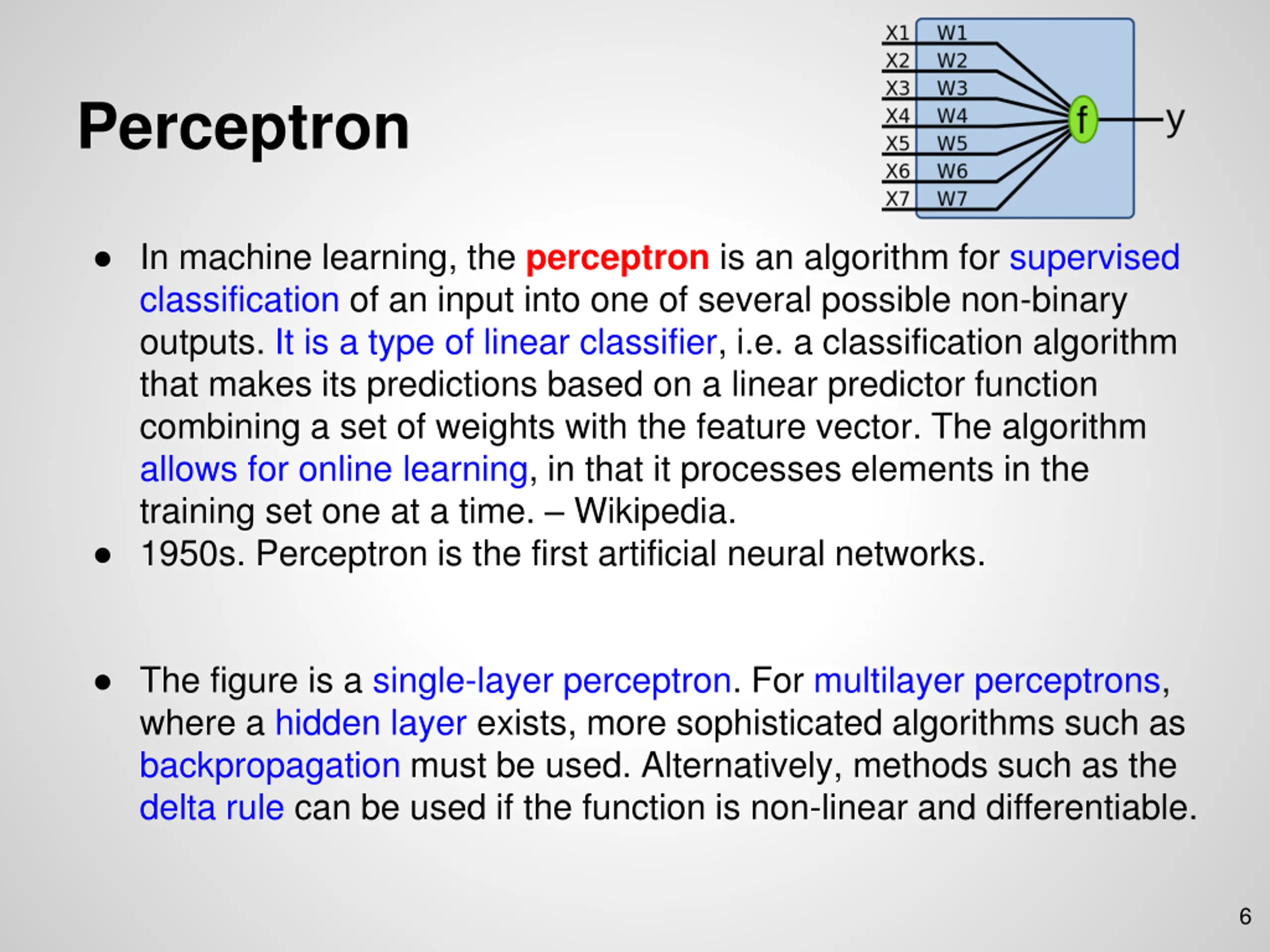 Perceptron In machine learning, the perceptron is an algorithm for supervised classification of an input into one of several possible non-binary outputs. It is a type of linear classifier, i.e. a classification algorithm that makes its predictions based on a linear predictor function combining a set of weights with the feature vector. The algorithm allows for online learning, in that it processes elements in the training set one at a time. Wikipedia. 1950s. Perceptron is the first artificial neural networks. The figure is a single-layer perceptron. For multilayer perceptrons, where a hidden layer exists, more sophisticated algorithms such as backpropagation must be used. Alternatively, methods such as the delta rule can be used if the function is non-linear and differentiable. 6