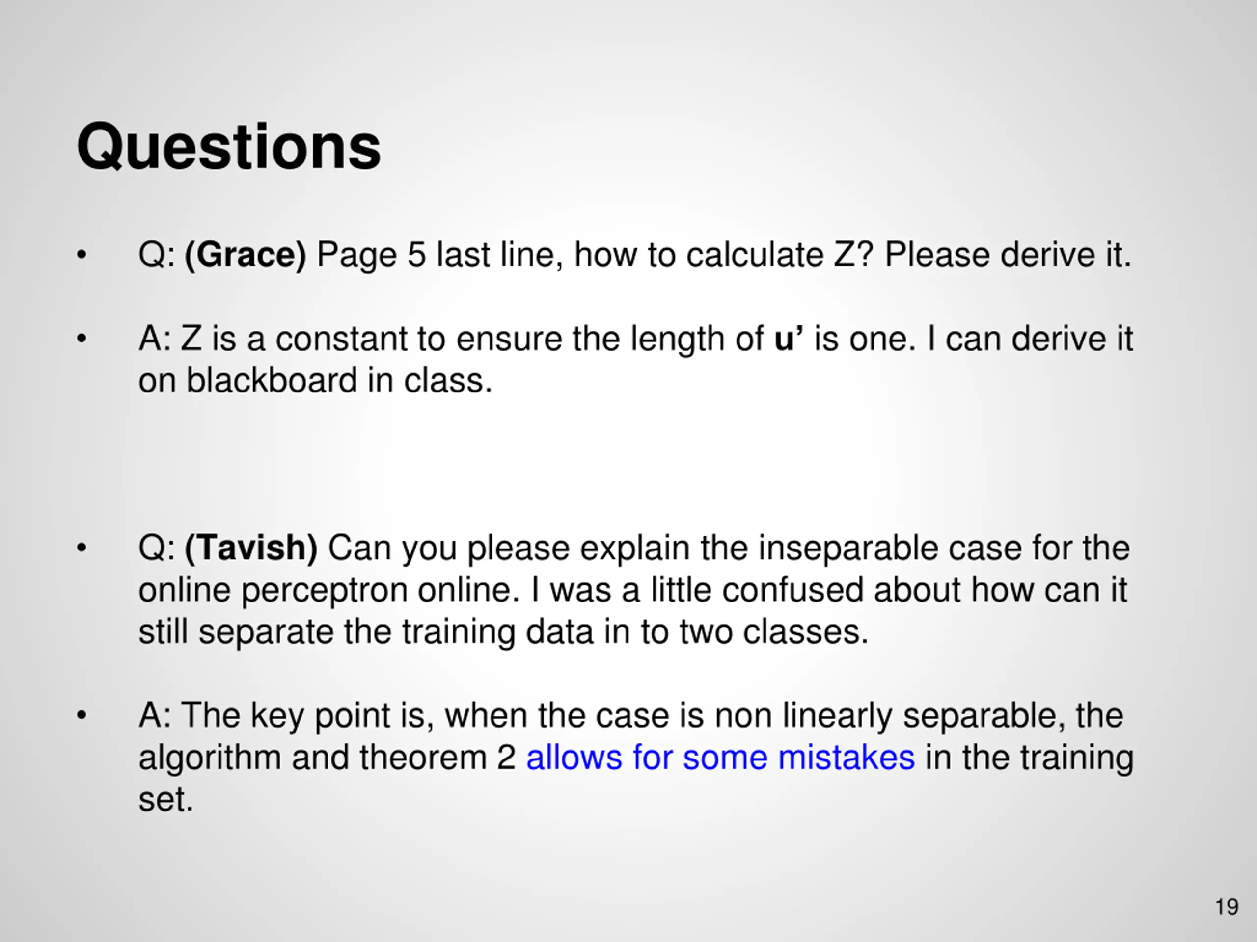 Questions Q: (Grace) Page 5 last line, how to calculate Z? Please derive it. A: Z is a constant to ensure the length of u is one. I can derive it on blackboard in class. Q: (Tavish) Can you please explain the inseparable case for the online perceptron online. I was a little confused about how can it still separate the training data in to two classes. A: The key point is, when the case is non linearly separable, the algorithm and theorem 2 allows for some mistakes in the training set. 19