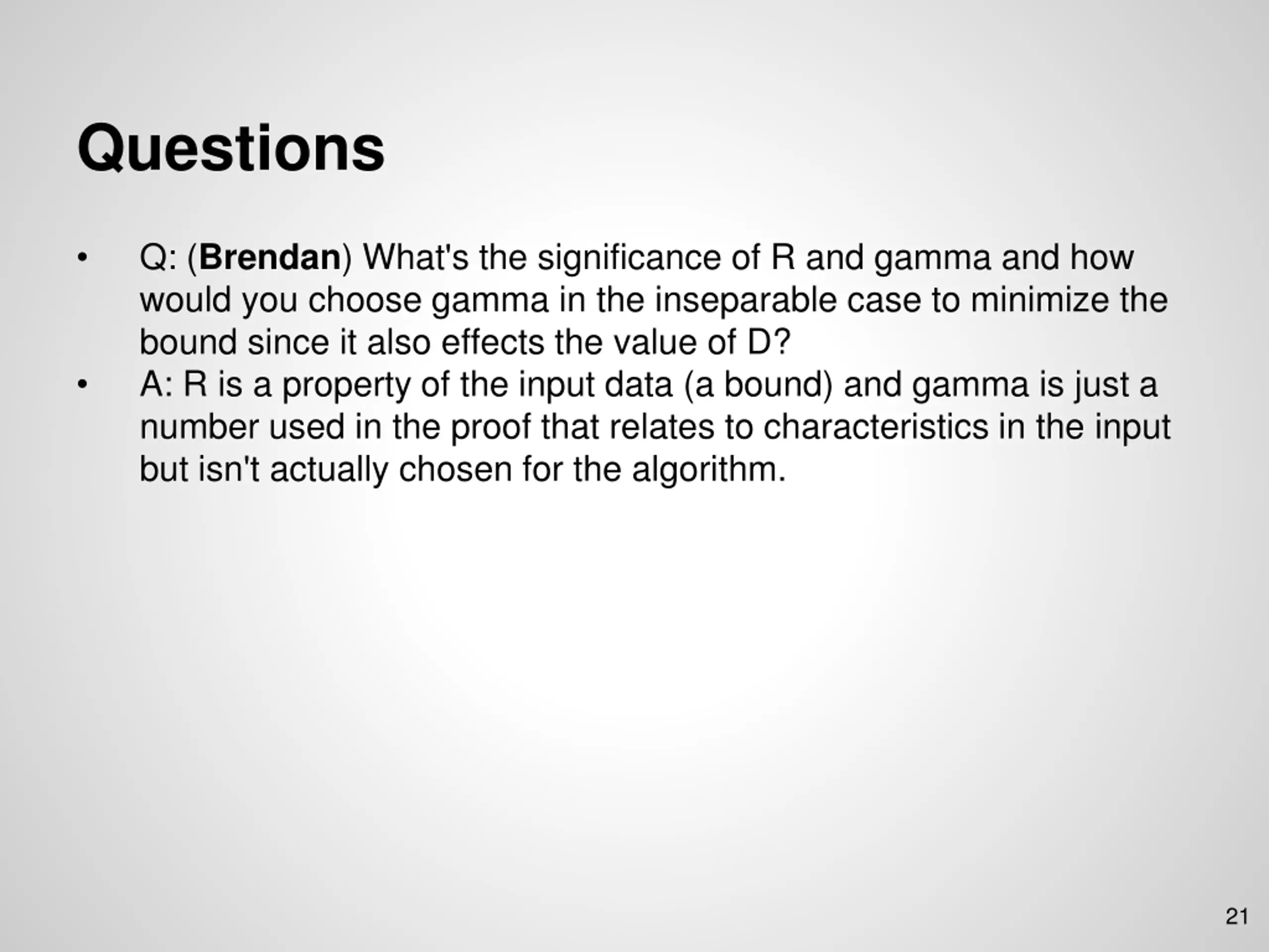 Questions Q: (Brendan) What's the significance of R and gamma and how would you choose gamma in the inseparable case to minimize the bound since it also effects the value of D? A: R is a property of the input data (a bound) and gamma is just a number used in the proof that relates to characteristics in the input but isn't actually chosen for the algorithm. 21