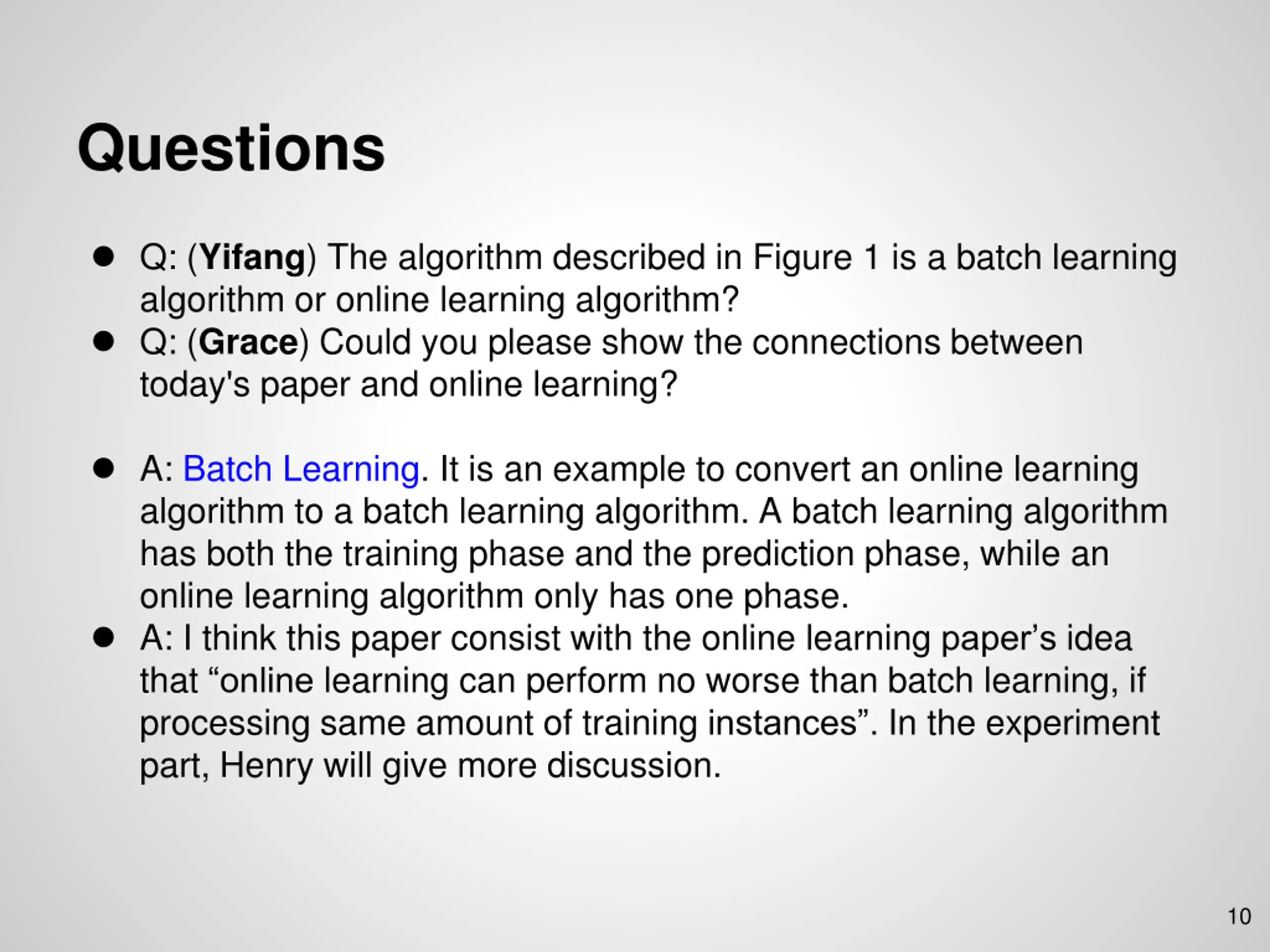 Questions Q: (Yifang) The algorithm described in Figure 1 is a batch learning algorithm or online learning algorithm? Q: (Grace) Could you please show the connections between today's paper and online learning? A: Batch Learning. It is an example to convert an online learning algorithm to a batch learning algorithm. A batch learning algorithm has both the training phase and the prediction phase, while an online learning algorithm only has one phase. A: I think this paper consist with the online learning paper s idea that online learning can perform no worse than batch learning, if processing same amount of training instances . In the experiment part, Henry will give more discussion. 10