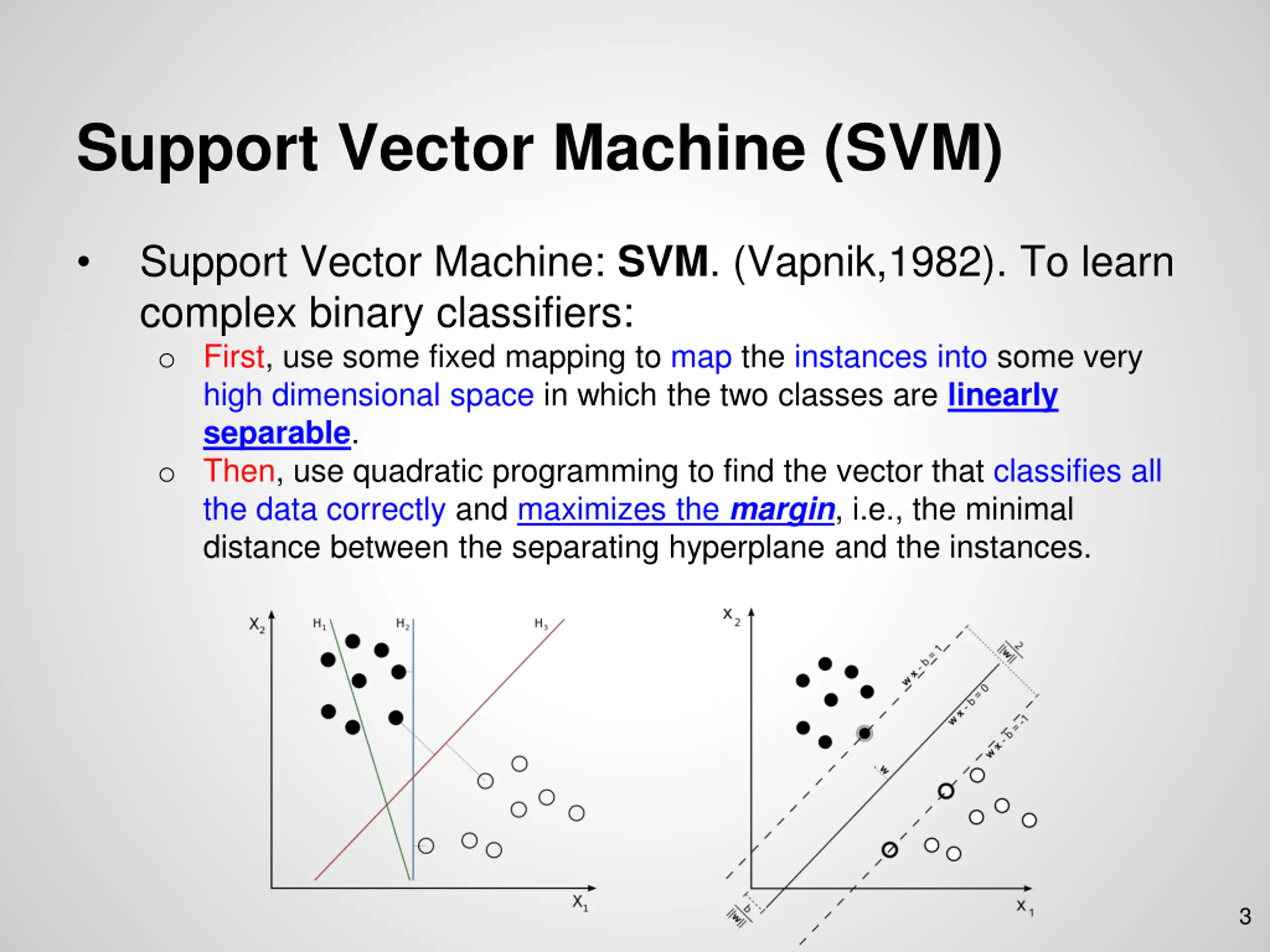 Support Vector Machine (SVM) Support Vector Machine: SVM. (Vapnik,1982). To learn complex binary classifiers: o First, use some fixed mapping to map the instances into some very high dimensional space in which the two classes are linearly separable. o Then, use quadratic programming to find the vector that classifies all the data correctly and maximizes the margin, i.e., the minimal distance between the separating hyperplane and the instances. 3