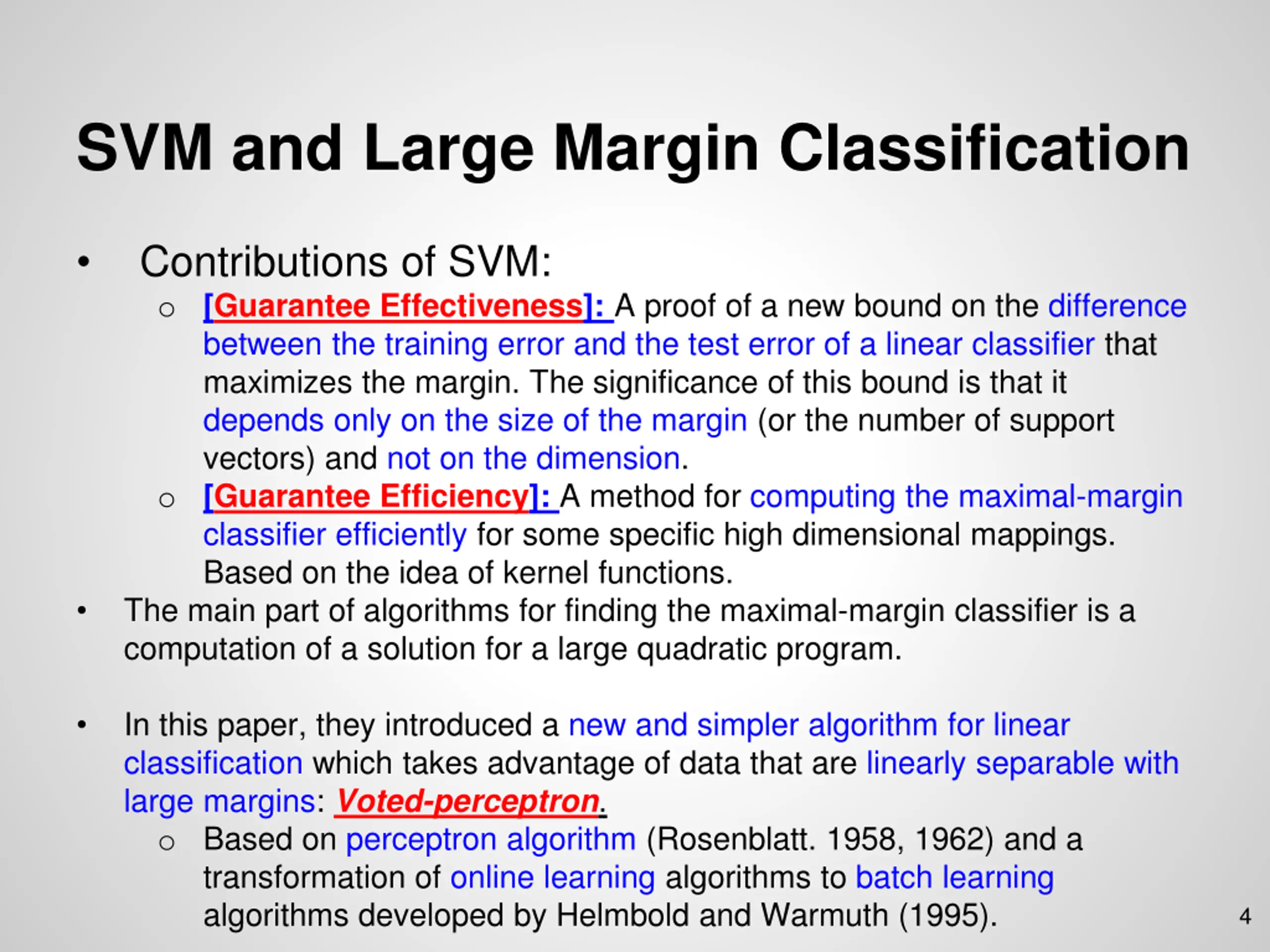 SVM and Large Margin Classification Contributions of SVM: o [Guarantee Effectiveness]: A proof of a new bound on the difference between the training error and the test error of a linear classifier that maximizes the margin. The significance of this bound is that it depends only on the size of the margin (or the number of support vectors) and not on the dimension. o [Guarantee Efficiency]: A method for computing the maximal-margin classifier efficiently for some specific high dimensional mappings. Based on the idea of kernel functions. The main part of algorithms for finding the maximal-margin classifier is a computation of a solution for a large quadratic program. In this paper, they introduced a new and simpler algorithm for linear classification which takes advantage of data that are linearly separable with large margins: Voted-perceptron. o Based on perceptron algorithm (Rosenblatt. 1958, 1962) and a transformation of online learning algorithms to batch learning algorithms developed by Helmbold and Warmuth (1995). 4