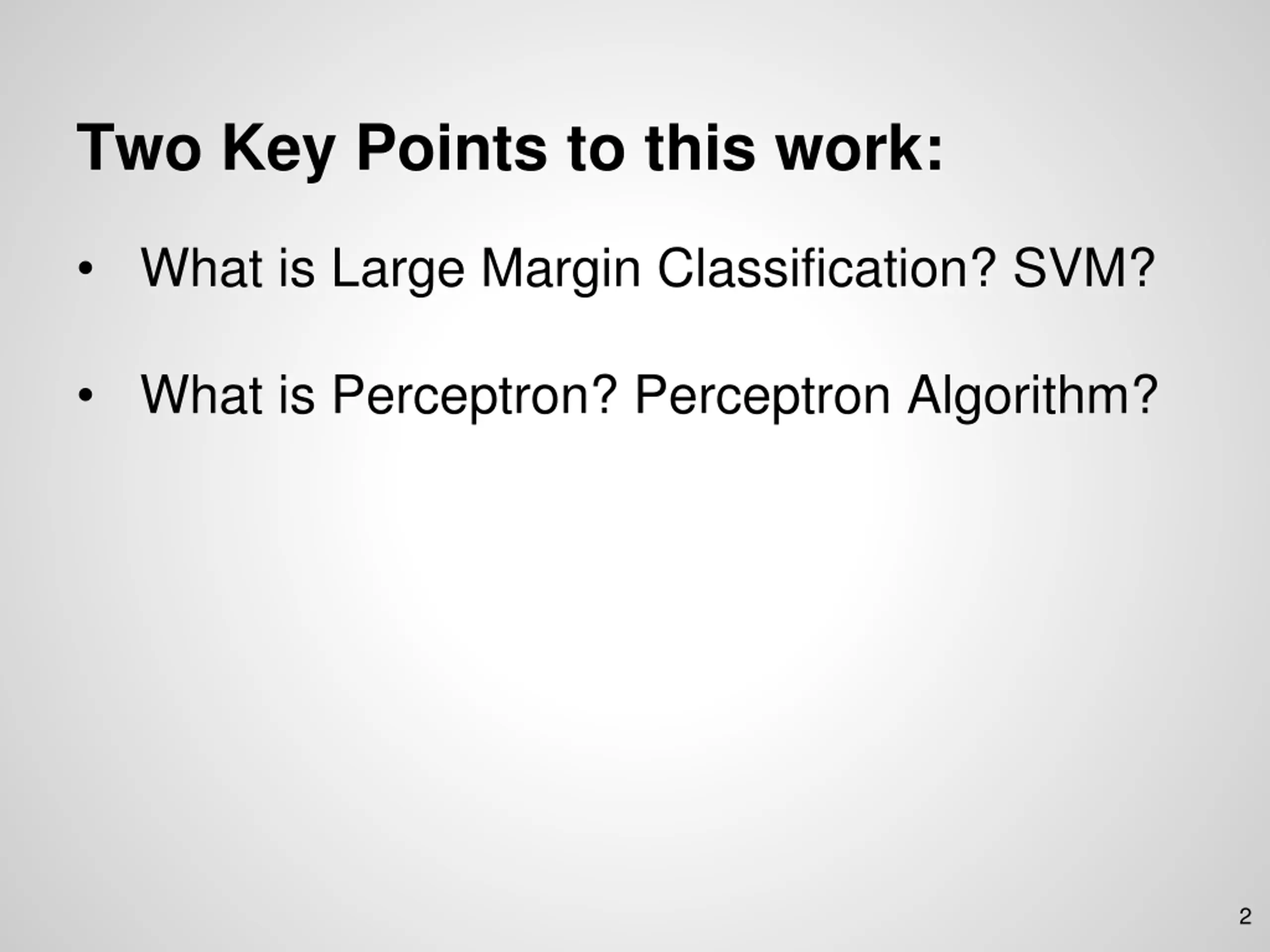 Two Key Points to this work: What is Large Margin Classification? SVM? What is Perceptron? Perceptron Algorithm? 2
