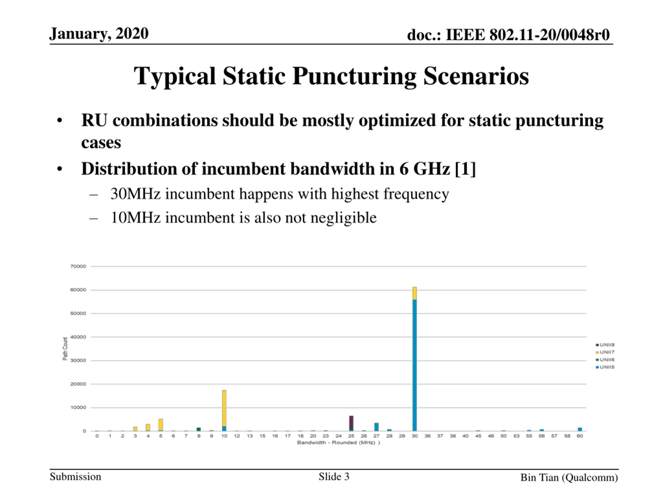 January, 2020 doc.: IEEE 802.11-20/0048r0 Typical Static Puncturing Scenarios RU combinations should be mostly optimized for static puncturing cases Distribution of incumbent bandwidth in 6 GHz [1] 30MHz incumbent happens with highest frequency 10MHz incumbent is also not negligible Submission Slide 3 Bin Tian (Qualcomm)