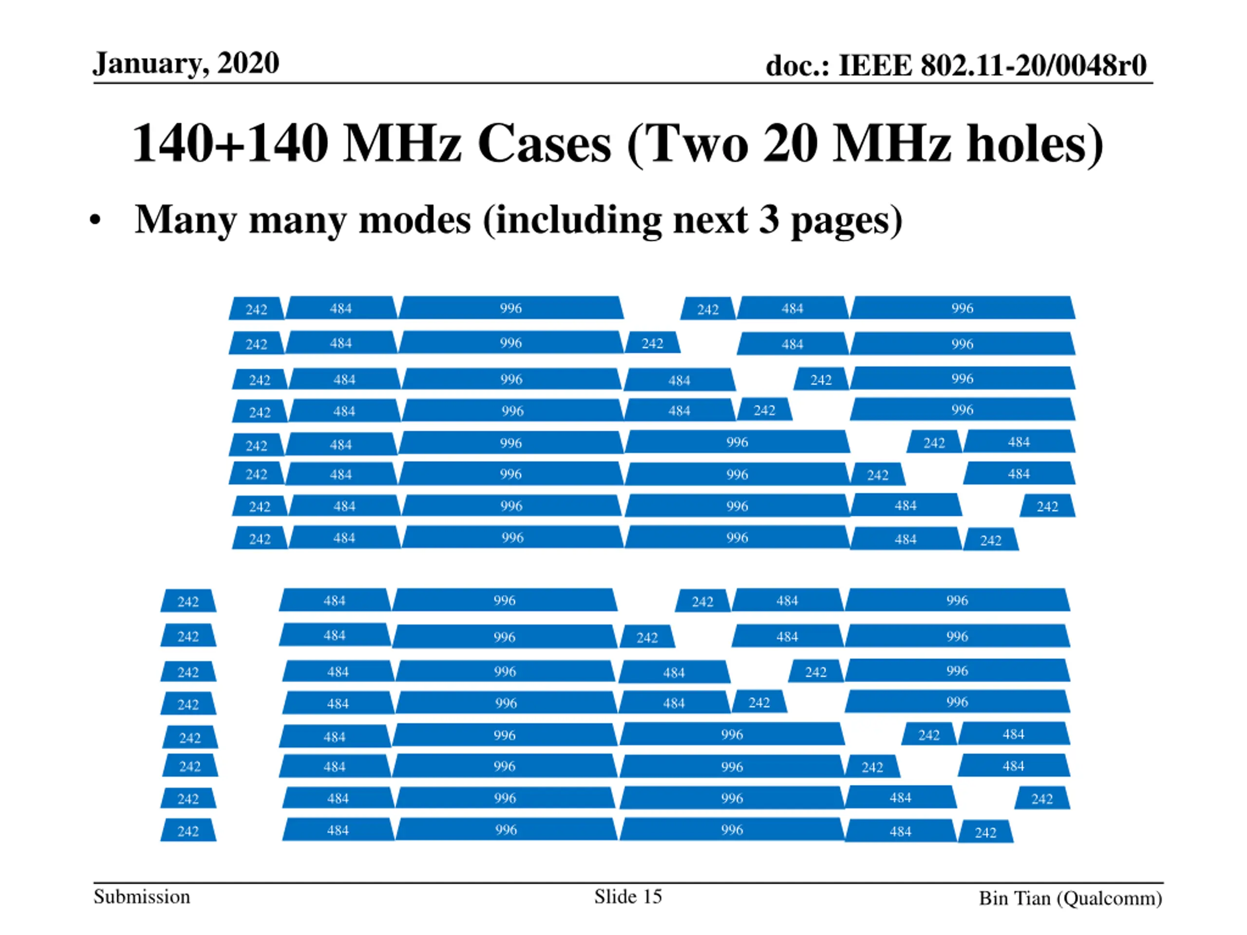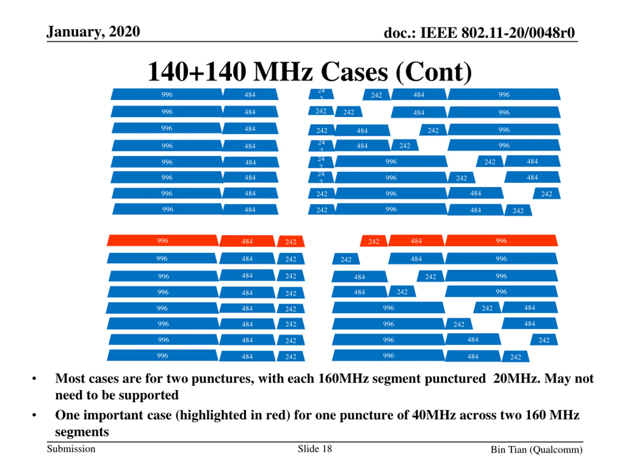 January, 2020 doc.: IEEE 802.11-20/0048r0 140+140 MHz Cases (cont) More modes 996 996 484 484 242 242 996 484 242 996 242 484 996 996 484 242 242 484 996 242 996 484 484 242 484 996 242 996 484 242 484 996 242 484 996 242 484 996 484 996 242 242 996 996 484 242 484 242 996 996 484 484 242 242 484 996 242 484 996 242 996 996 484 242 242 484 996 242 484 996 484 242 484 996 242 484 996 242 484 996 242 484 996 242 484 996 996 484 242 242 996 996 484 242 484 242 Submission Slide 17 Bin Tian (Qualcomm)