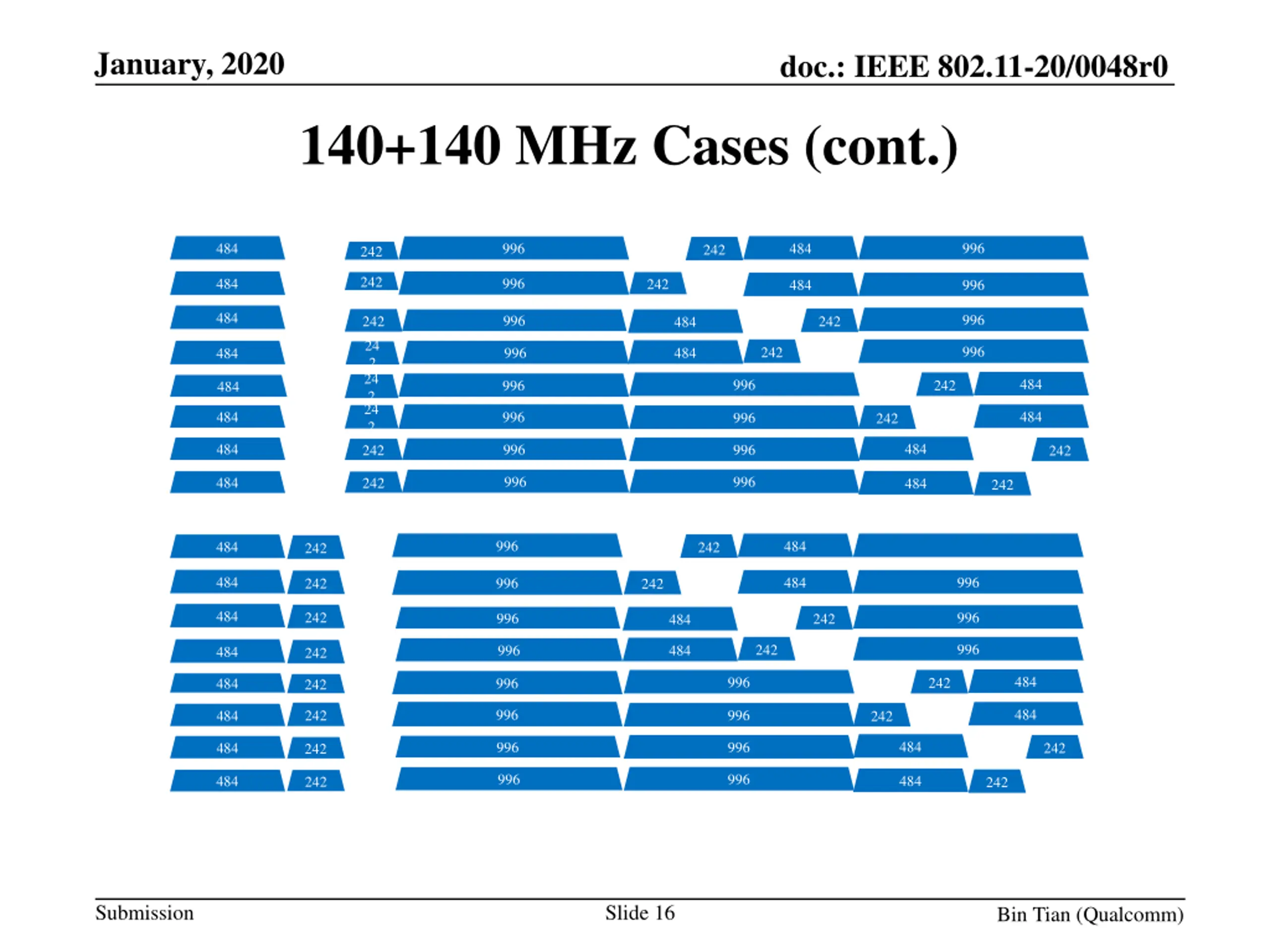 January, 2020 doc.: IEEE 802.11-20/0048r0 140+140 MHz Cases (Two 20 MHz holes) Many many modes (including next 3 pages) 996 996 484 484 242 242 996 484 242 996 242 484 996 996 484 242 242 484 996 242 484 996 484 242 484 996 242 996 484 242 484 996 242 484 996 242 484 996 484 996 242 242 996 996 484 242 484 242 996 996 484 484 242 242 484 996 242 484 996 242 996 996 484 242 242 484 996 242 996 484 484 242 484 996 242 996 484 242 484 996 242 484 996 242 484 996 996 484 242 242 996 996 484 242 484 242 Submission Slide 15 Bin Tian (Qualcomm)