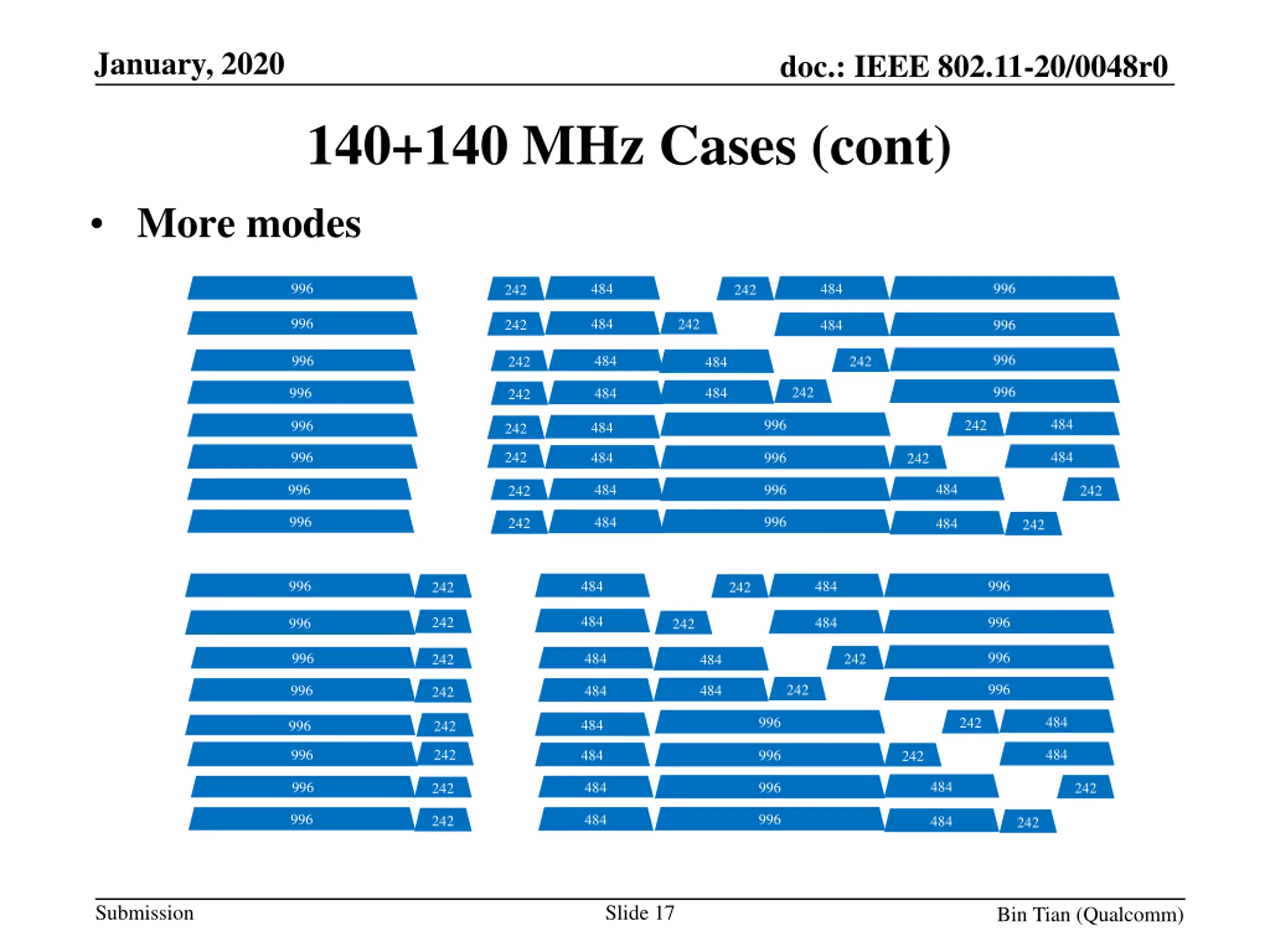 January, 2020 doc.: IEEE 802.11-20/0048r0 140+140 MHz Cases (cont.) 996 996 484 484 242 242 242 996 484 242 996 484 484 996 996 242 242 484 24 2 24 2 24 2 242 996 242 996 484 484 484 996 242 996 484 484 996 484 996 242 484 484 996 996 242 996 996 484 242 484 242 996 996 484 484 242 242 484 996 484 996 242 242 484 996 242 996 242 484 996 242 484 996 484 242 484 996 242 996 484 242 484 996 996 242 484 242 484 996 996 484 242 242 996 996 484 484 242 242 Submission Slide 16 Bin Tian (Qualcomm)