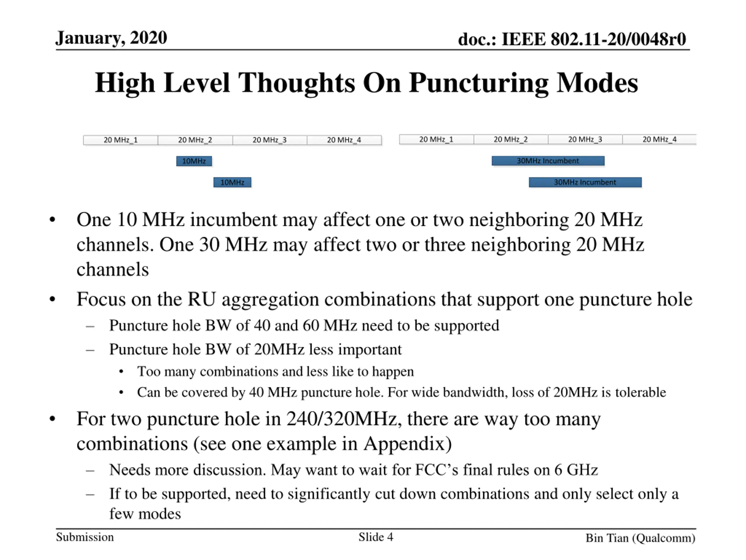 January, 2020 doc.: IEEE 802.11-20/0048r0 High Level Thoughts On Puncturing Modes 20 MHz_1 20 MHz_2 20 MHz_3 20 MHz_4 20 MHz_1 20 MHz_2 20 MHz_3 20 MHz_4 30MHz Incumbent 10MHz 30MHz Incumbent 10MHz One 10 MHz incumbent may affect one or two neighboring 20 MHz channels. One 30 MHz may affect two or three neighboring 20 MHz channels Focus on the RU aggregation combinations that support one puncture hole Puncture hole BW of 40 and 60 MHz need to be supported Puncture hole BW of 20MHz less important Too many combinations and less like to happen Can be covered by 40 MHz puncture hole. For wide bandwidth, loss of 20MHz is tolerable For two puncture hole in 240/320MHz, there are way too many combinations (see one example in Appendix) Needs more discussion. May want to wait for FCC s final rules on 6 GHz If to be supported, need to significantly cut down combinations and only select only a few modes Submission Slide 4 Bin Tian (Qualcomm)