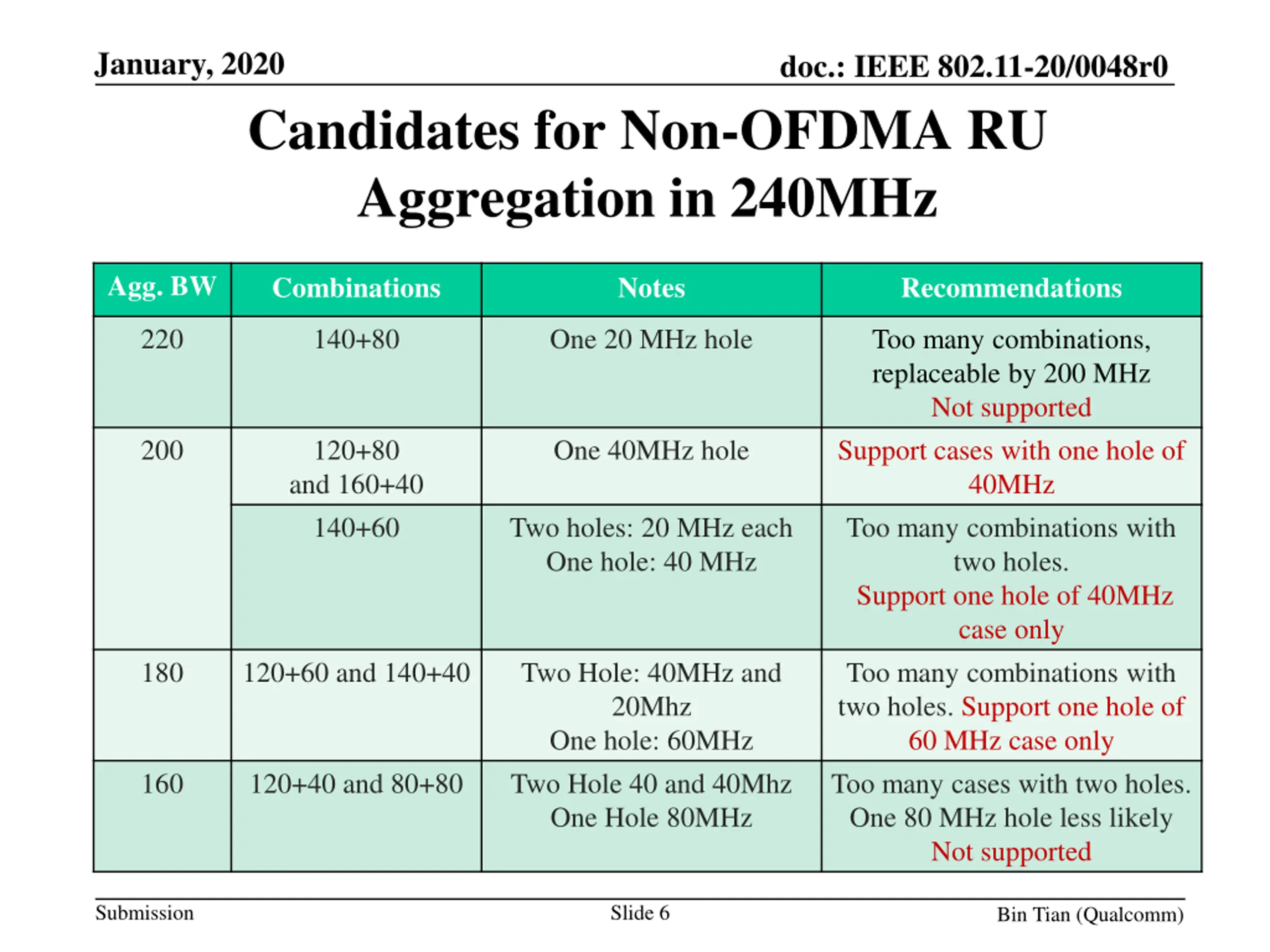 January, 2020 doc.: IEEE 802.11-20/0048r0 Candidates for Non-OFDMA RU Aggregation in 320MHz Agg. BW Combinations Notes Recommendations 300 160+140 One hole of 20MHz Too many combinations, replaceable by 280 MHz Not supported Support cases with one hole of 40MHz Too many combinations with two holes. Support one hole of 40MHz case only Too many combinations with two holes. Support one hole of 60 MHz case only support Too many cases, need more discussions 280 160+120 One hole of 40 MHz 140+140 Two 20 MHz holes One 40MHz hole 260 140+120 and 160+100 Two holes: 20 and 40MHz; One hole: 60 MHz 240 160+80 120+120 Two holes: 40MHz each One hole: 80 MHz Submission Slide 5 Bin Tian (Qualcomm)
