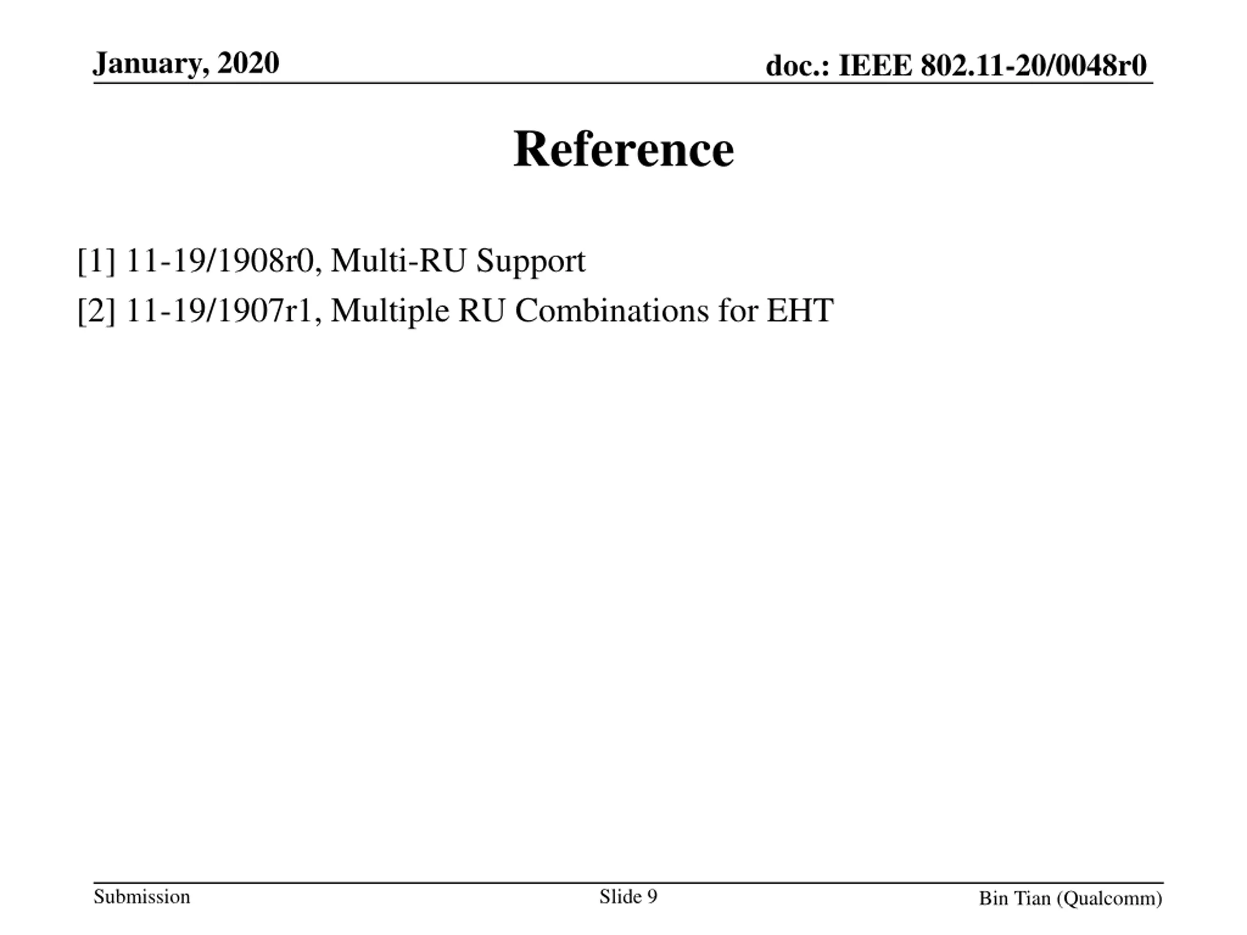 January, 2020 doc.: IEEE 802.11-20/0048r0 Reference [1] 11-19/1908r0, Multi-RU Support [2] 11-19/1907r1, Multiple RU Combinations for EHT Submission Slide 9 Bin Tian (Qualcomm)
