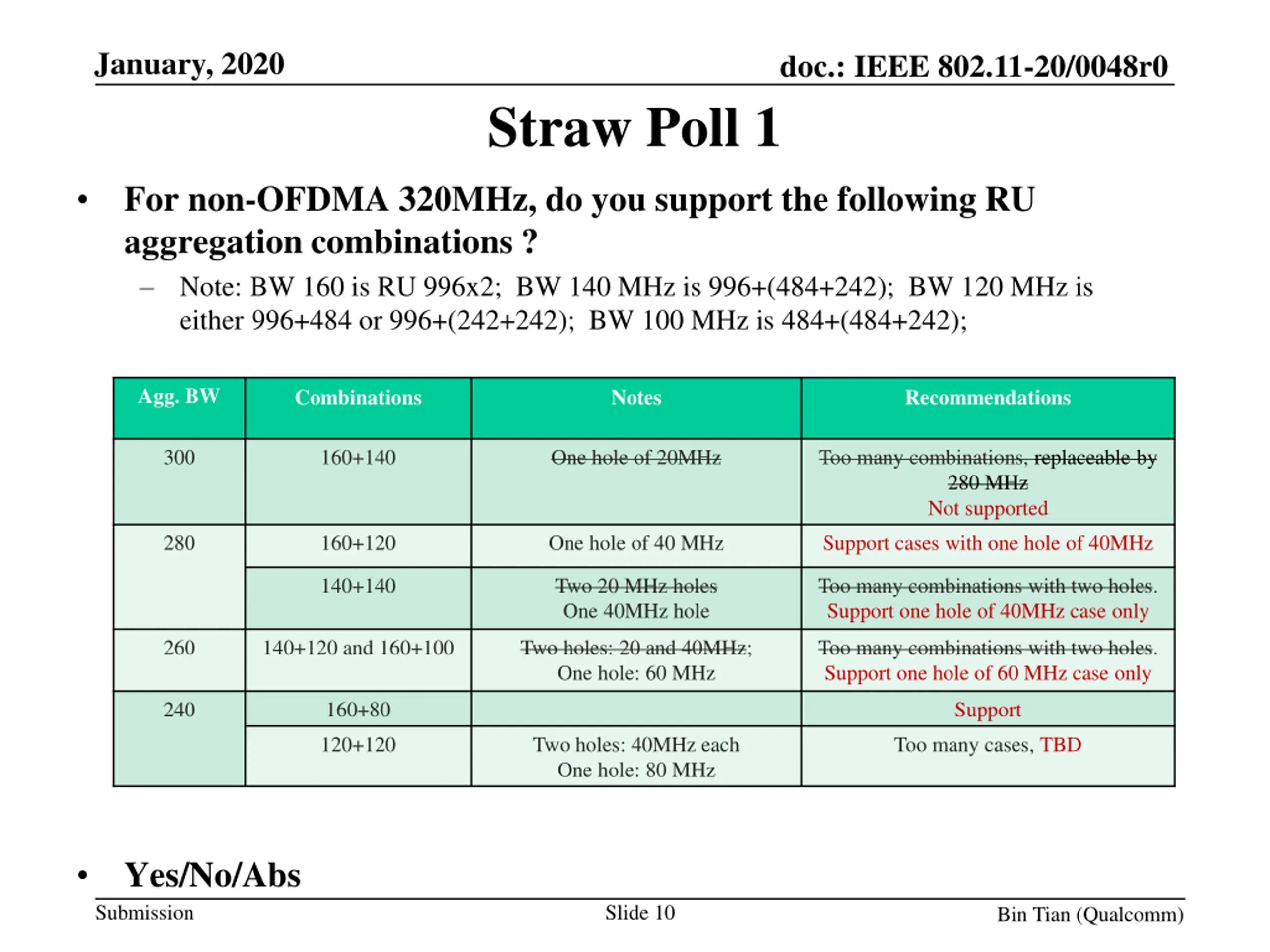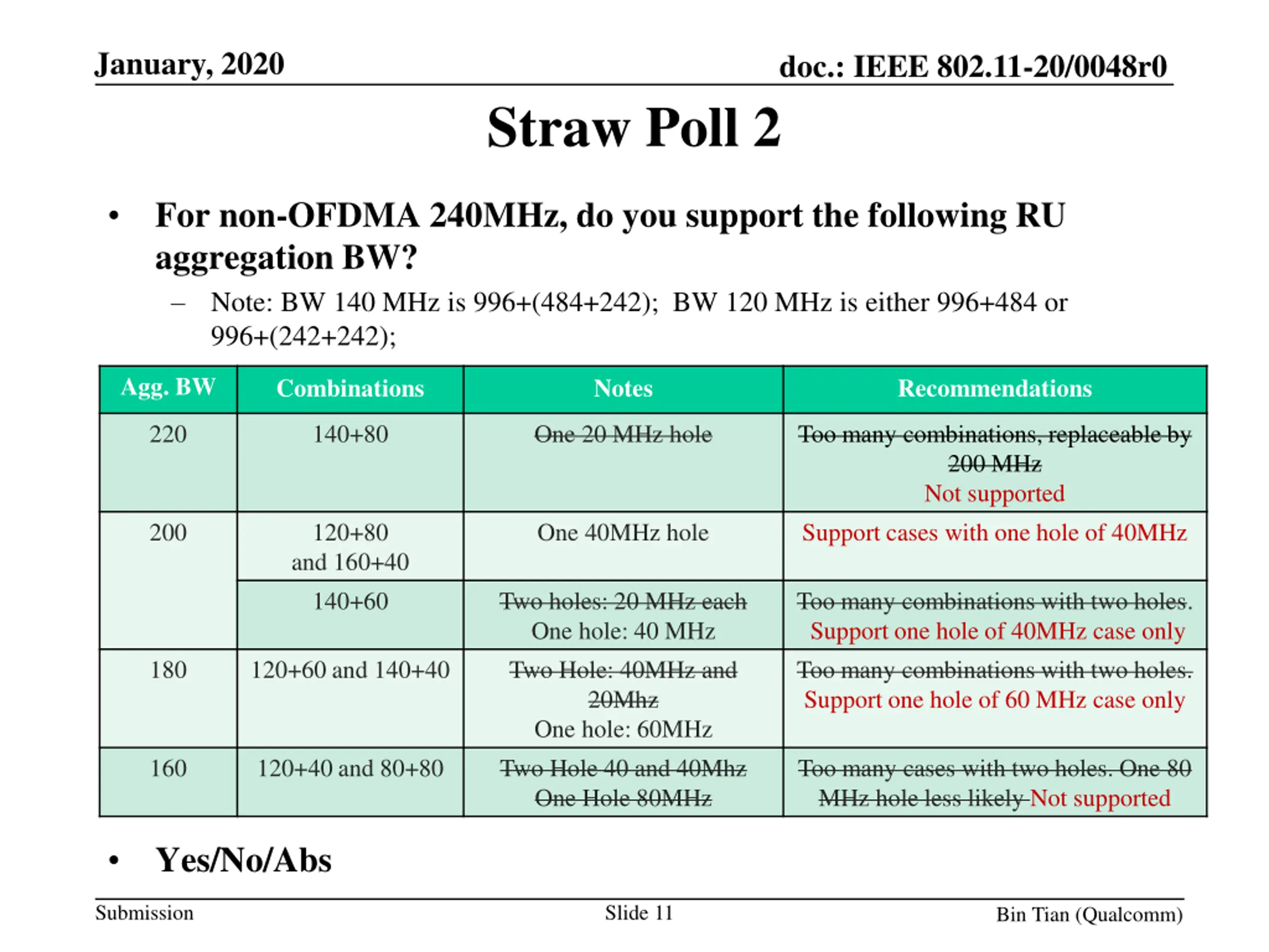 January, 2020 doc.: IEEE 802.11-20/0048r0 Straw Poll 1 For non-OFDMA 320MHz, do you support the following RU aggregation combinations ? Note: BW 160 is RU 996x2; BW 140 MHz is 996+(484+242); BW 120 MHz is either 996+484 or 996+(242+242); BW 100 MHz is 484+(484+242); Agg. BW Combinations Notes Recommendations 300 160+140 One hole of 20MHz Too many combinations, replaceable by 280 MHz Not supported 280 160+120 One hole of 40 MHz Support cases with one hole of 40MHz 140+140 Two 20 MHz holes One 40MHz hole Too many combinations with two holes. Support one hole of 40MHz case only 260 140+120 and 160+100 Two holes: 20 and 40MHz; One hole: 60 MHz Too many combinations with two holes. Support one hole of 60 MHz case only 240 160+80 Support 120+120 Two holes: 40MHz each One hole: 80 MHz Too many cases, TBD Yes/No/Abs Submission Slide 10 Bin Tian (Qualcomm)