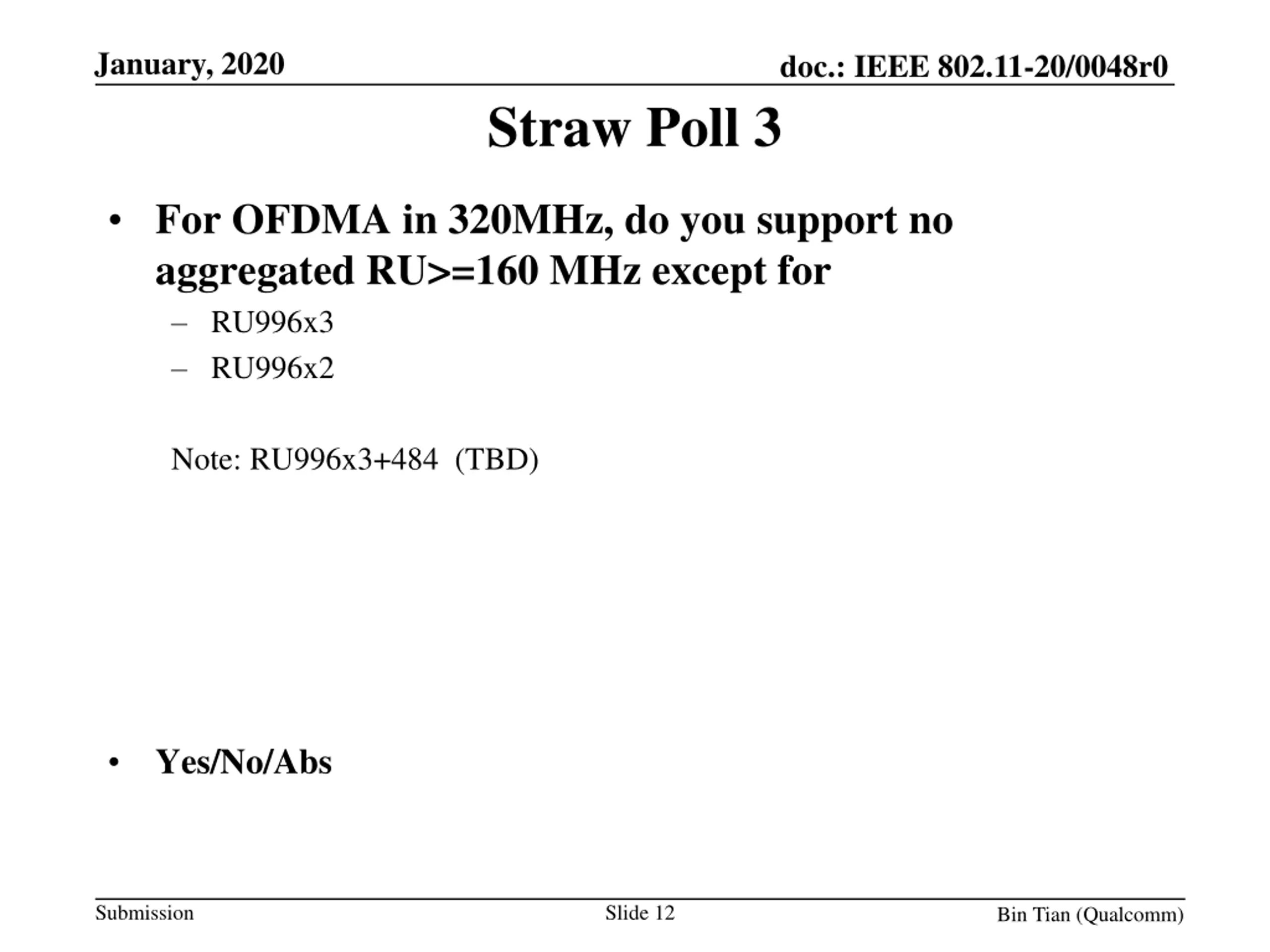 January, 2020 doc.: IEEE 802.11-20/0048r0 Straw Poll 3 For OFDMA in 320MHz, do you support no aggregated RU>=160 MHz except for RU996x3 RU996x2 Note: RU996x3+484 (TBD) Yes/No/Abs Submission Slide 12 Bin Tian (Qualcomm)