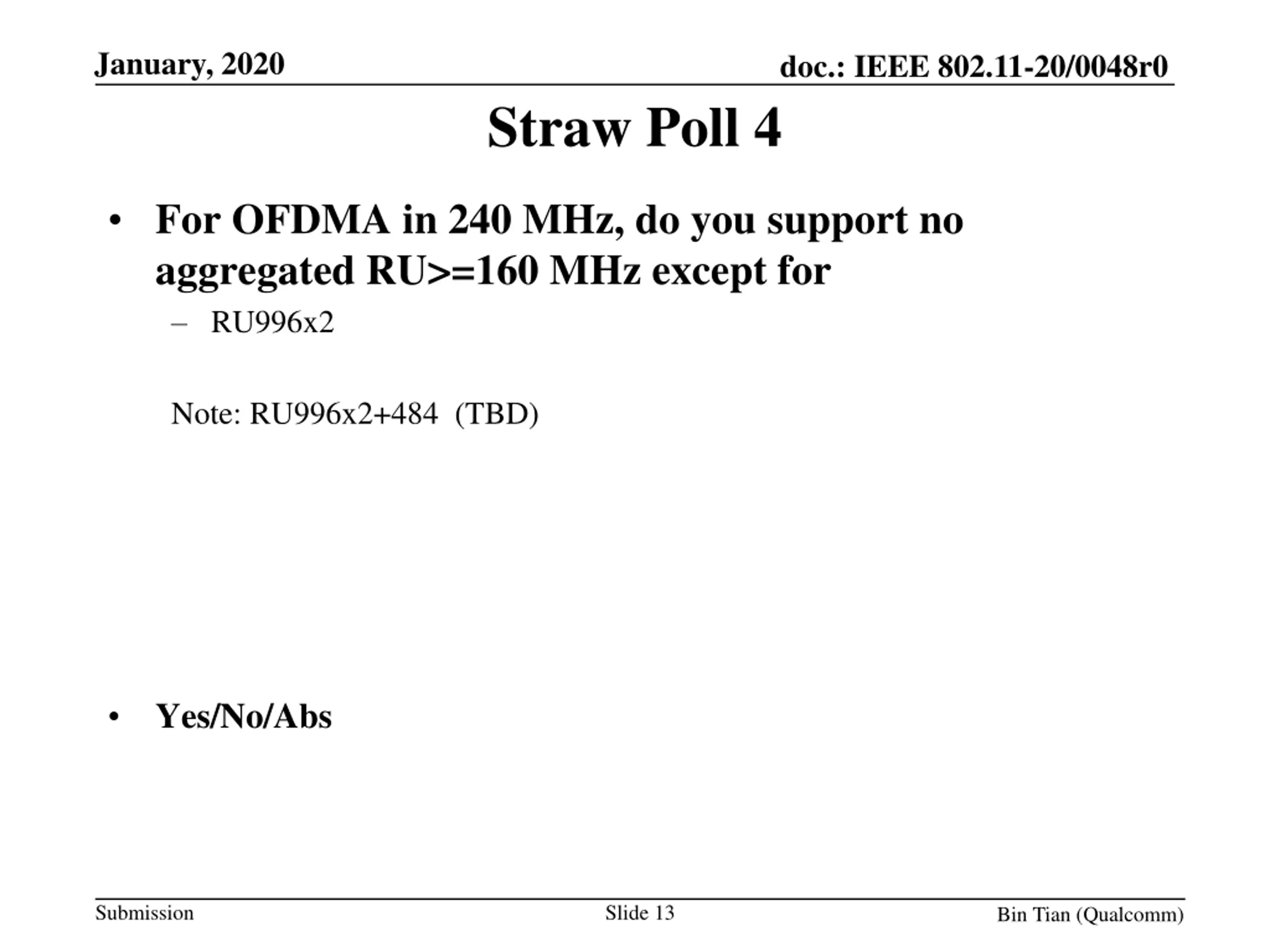 January, 2020 doc.: IEEE 802.11-20/0048r0 Straw Poll 4 For OFDMA in 240 MHz, do you support no aggregated RU>=160 MHz except for RU996x2 Note: RU996x2+484 (TBD) Yes/No/Abs Submission Slide 13 Bin Tian (Qualcomm)