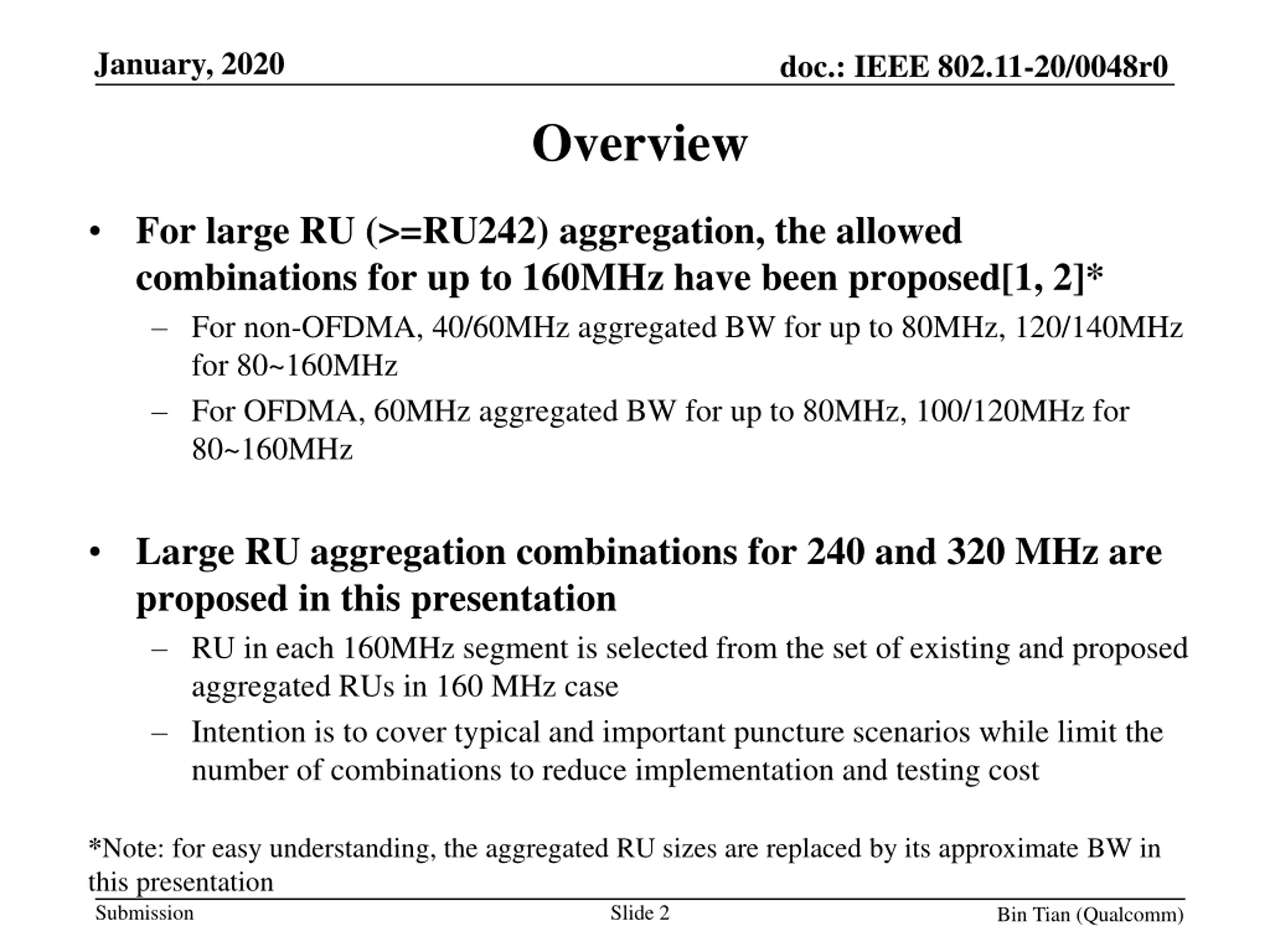 January, 2020 doc.: IEEE 802.11-20/0048r0 Overview For large RU (>=RU242) aggregation, the allowed combinations for up to 160MHz have been proposed[1, 2]* For non-OFDMA, 40/60MHz aggregated BW for up to 80MHz, 120/140MHz for 80~160MHz For OFDMA, 60MHz aggregated BW for up to 80MHz, 100/120MHz for 80~160MHz Large RU aggregation combinations for 240 and 320 MHz are proposed in this presentation RU in each 160MHz segment is selected from the set of existing and proposed aggregated RUs in 160 MHz case Intention is to cover typical and important puncture scenarios while limit the number of combinations to reduce implementation and testing cost *Note: for easy understanding, the aggregated RU sizes are replaced by its approximate BW in this presentation Slide 2 Submission Bin Tian (Qualcomm)