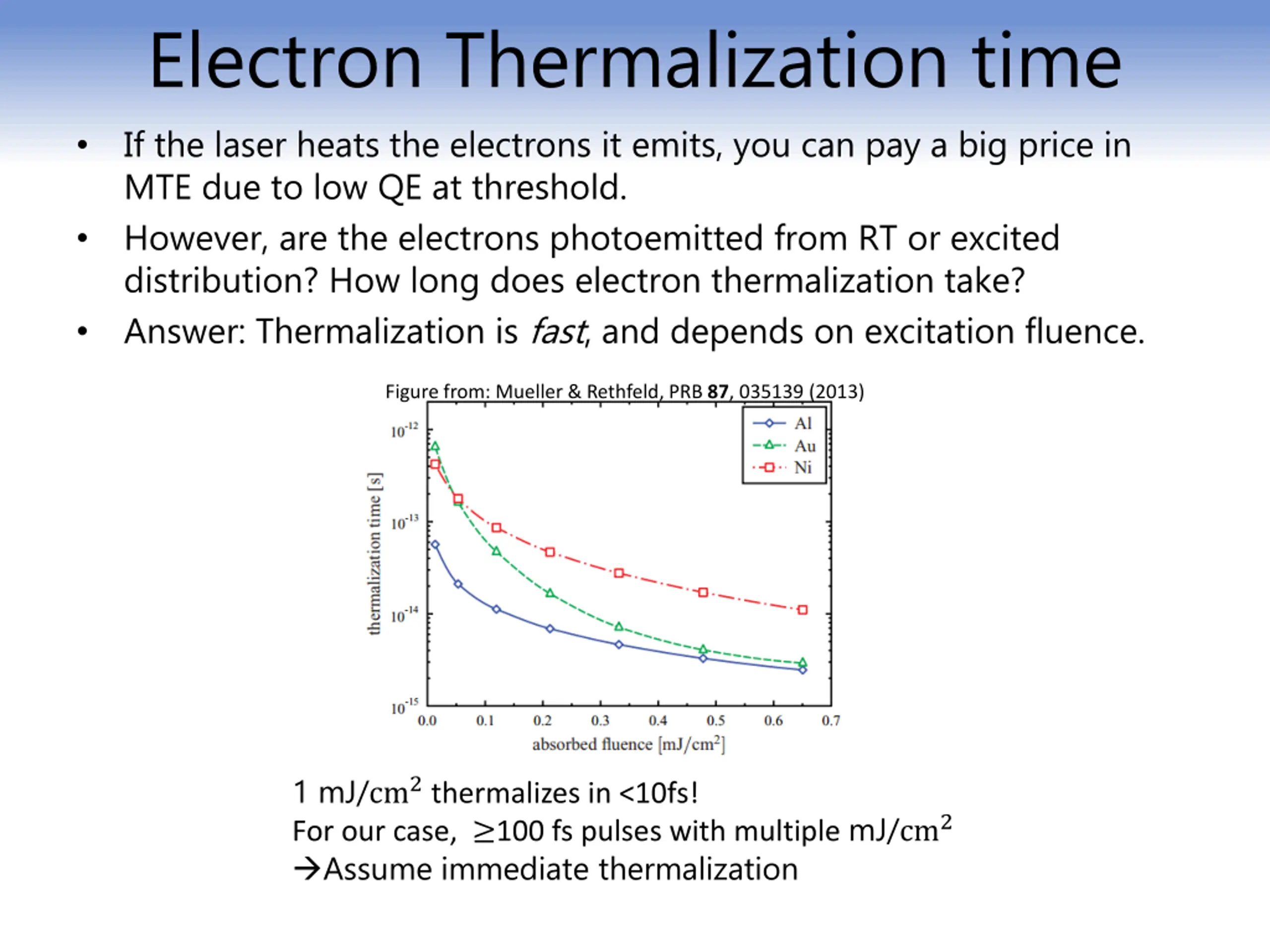 Electron Thermalization time If the laser heats the electrons it emits, you can pay a big pricein MTE due to low QE at threshold. However, are the electrons photoemitted from RT or excited distribution? How long does electron thermalization take? Answer: Thermalization is fast, and depends on excitation fluence. Figure from: Mueller & Rethfeld, PRB 87, 035139 (2013) 1 mJ/cm2 thermalizes in <10fs! For our case, 100 fs pulses with multiple mJ/cm2 Assume immediate thermalization