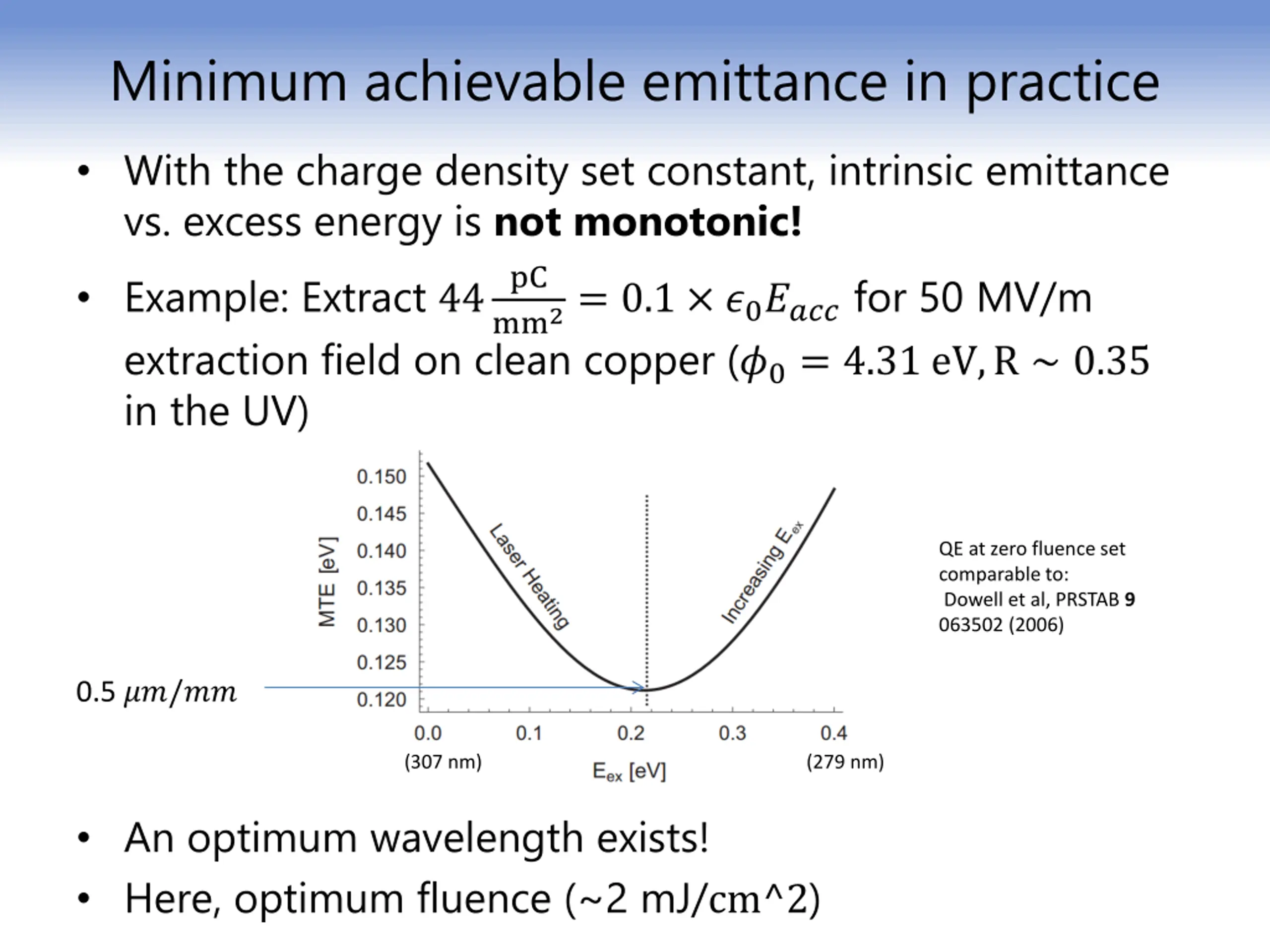 Minimum achievable emittance in practice With the charge density set constant, intrinsic emittance vs. excess energy is not monotonic! Example: Extract 44 extraction field on clean copper (?0= 4.31 eV,R 0.35 in the UV) pC mm2= 0.1 ?0???? for 50 MV/m QE at zero fluence set comparable to: Dowell et al, PRSTAB 9 063502 (2006) 0.5 ??/?? (307 nm) (279 nm) An optimum wavelength exists! Here, optimum fluence (~2 mJ/cm^2)