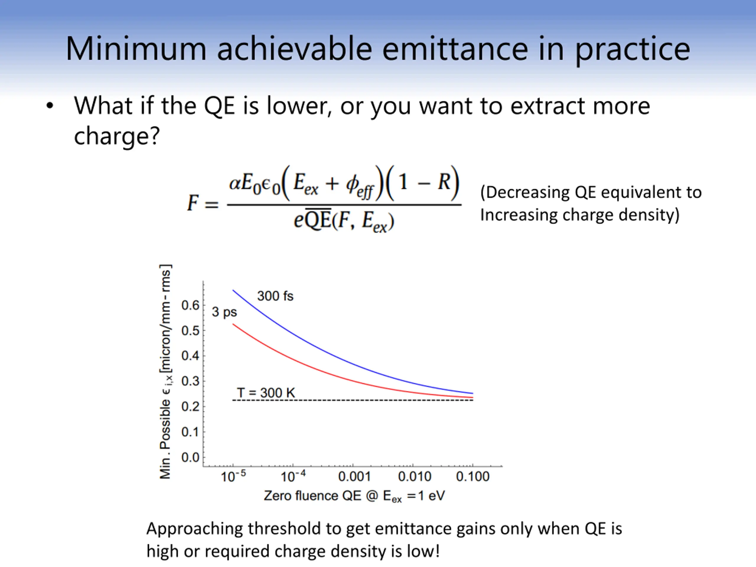 Minimum achievable emittance in practice What if the QE is lower, or you want to extract more charge? (Decreasing QE equivalent to Increasing charge density) Approaching threshold to get emittance gains only when QE is high or required charge density is low!