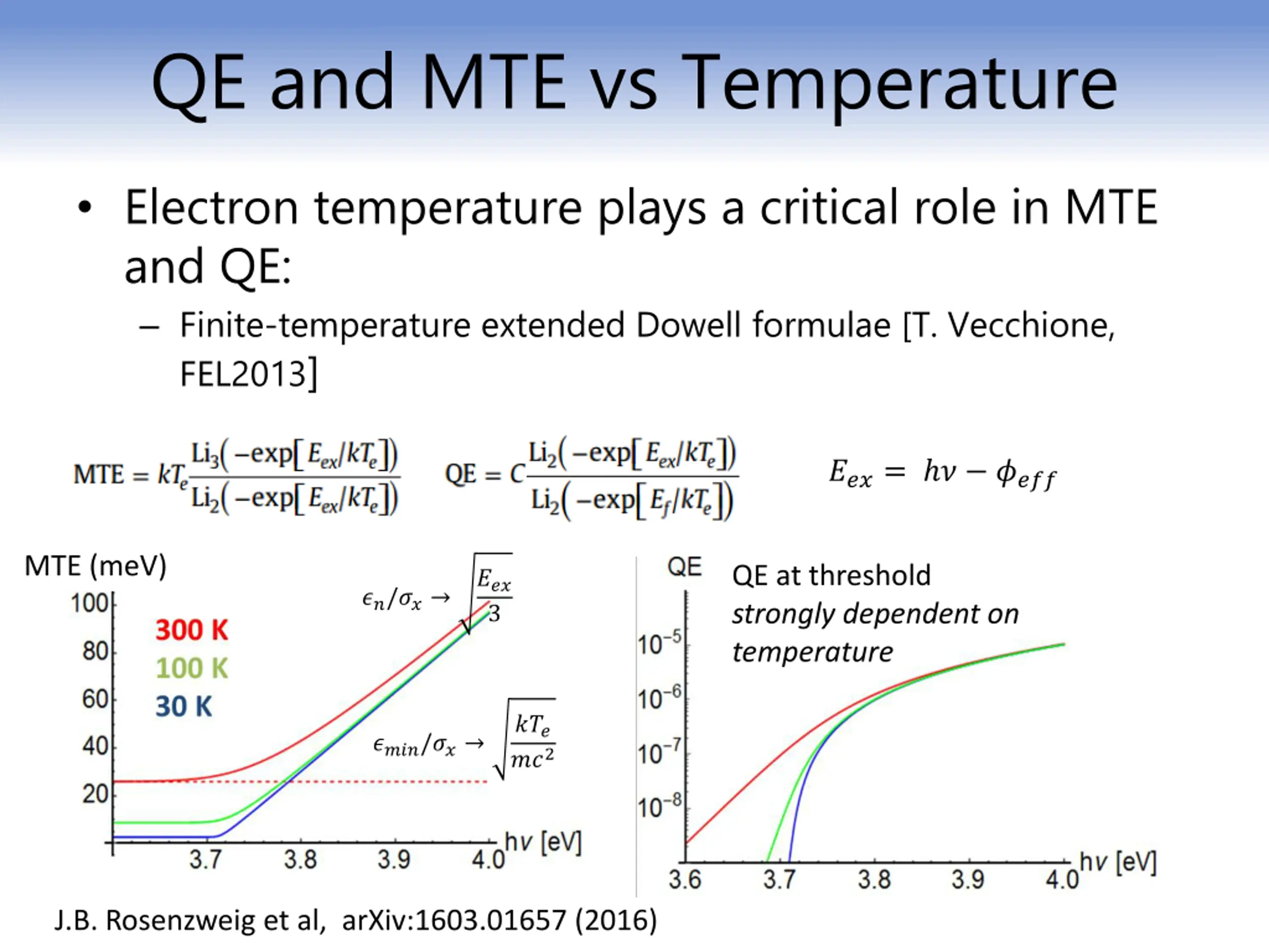 QE and MTE vs Temperature Electron temperature plays a critical role in MTE and QE: Finite-temperature extended Dowell formulae [T. Vecchione, FEL2013] ???= ? ???? MTE (meV) QE at threshold strongly dependent on temperature ??? 3 ??/?? ??? ??2 ????/?? J.B. Rosenzweig et al, arXiv:1603.01657 (2016)