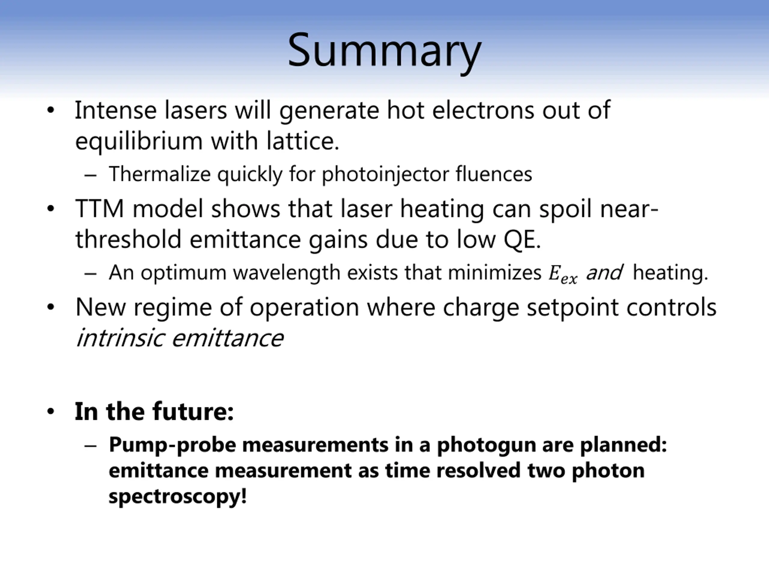 Summary Intense lasers will generate hot electrons out of equilibrium with lattice. Thermalize quickly for photoinjector fluences TTM model shows that laser heating can spoil near- threshold emittance gains due to low QE. An optimum wavelength exists that minimizes ??? and heating. New regime of operation where charge setpoint controls intrinsic emittance In the future: Pump-probe measurements in a photogun are planned: emittance measurement as time resolved two photon spectroscopy!