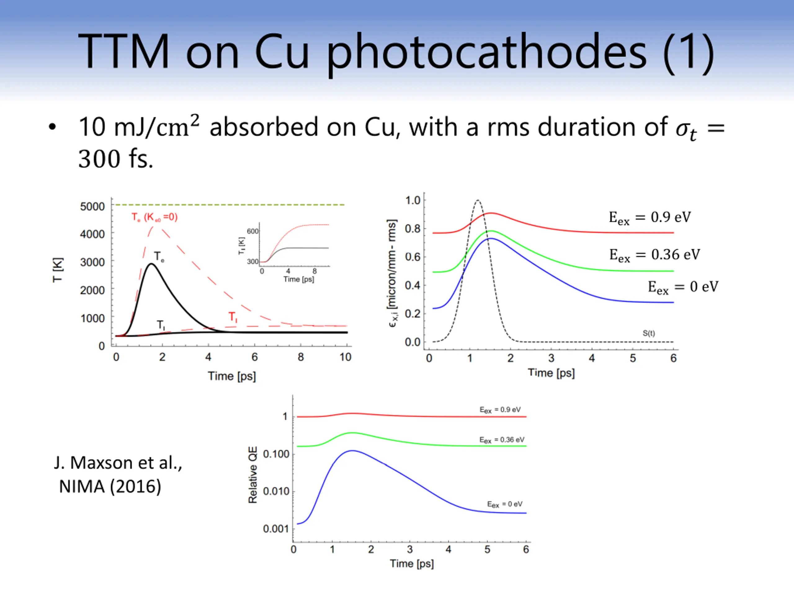 TTM on Cu photocathodes (1) 10 mJ/cm2 absorbed on Cu, with a rms duration of ??= 300 fs. Eex= 0.9 eV Eex= 0.36 eV Eex= 0 eV J. Maxson et al., NIMA (2016)
