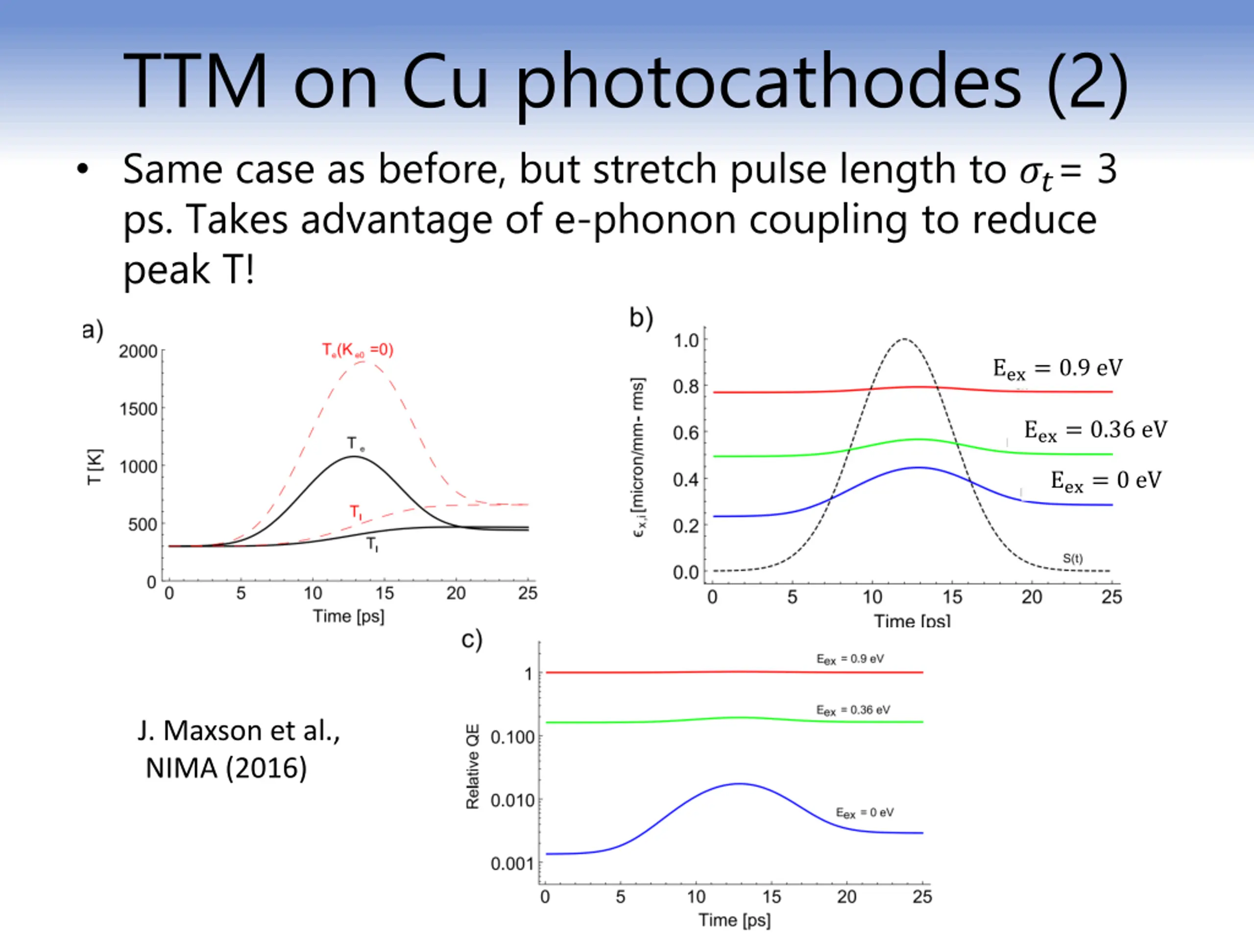 TTM on Cu photocathodes (2) Same case as before, but stretch pulse length to ??= 3 ps. Takes advantage of e-phonon coupling to reduce peak T! Eex= 0.9 eV Eex= 0.36 eV Eex= 0 eV J. Maxson et al., NIMA (2016)