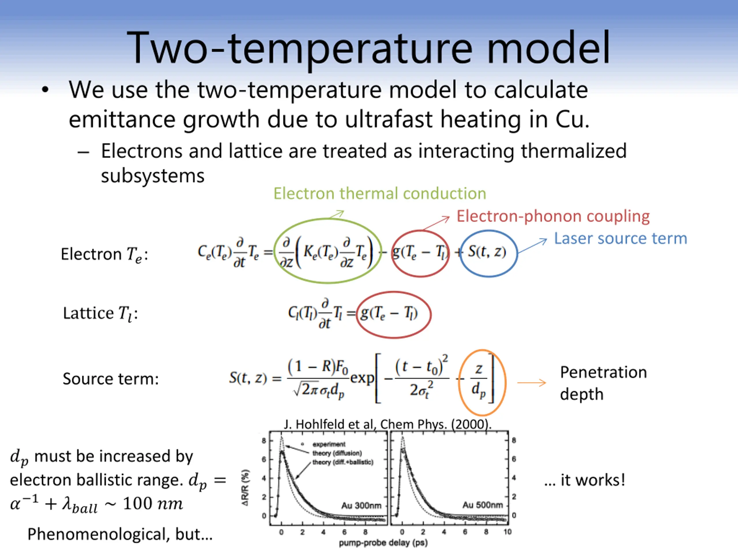 Two-temperature model We use the two-temperature model to calculate emittance growth due to ultrafast heating in Cu. Electrons and lattice are treated as interacting thermalized subsystems Electron thermal conduction Electron-phonon coupling Laser source term Electron ??: Lattice ??: Penetration depth Source term: J. Hohlfeld et al, Chem Phys. (2000). ?? must be increased by electron ballistic range. ??= ? 1+ ????? 100 ?? it works! Phenomenological, but