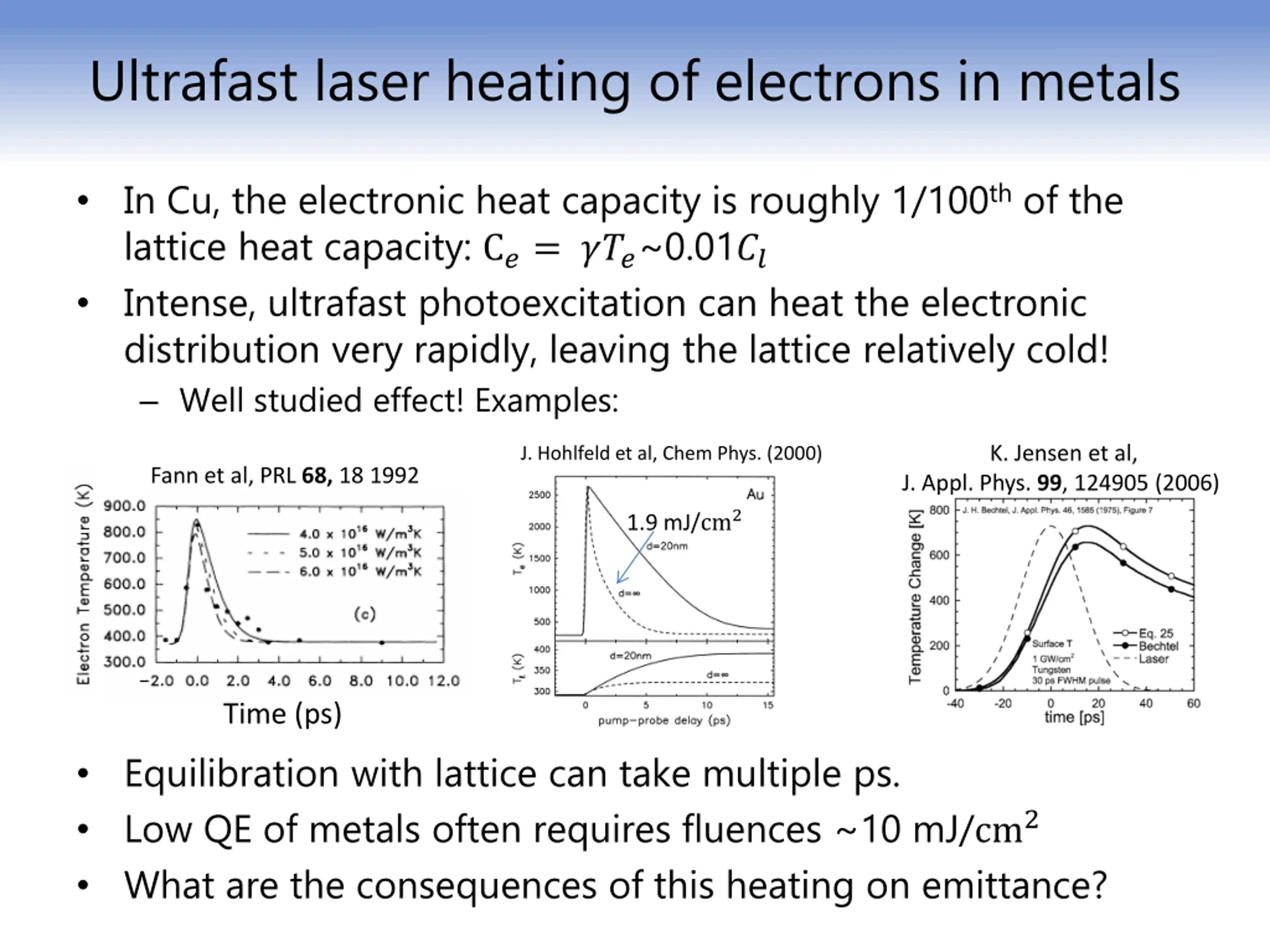 Ultrafast laser heating of electrons in metals In Cu, the electronic heat capacity is roughly 1/100thof the lattice heat capacity: C?= ???~0.01?? Intense, ultrafast photoexcitation can heat the electronic distribution very rapidly, leaving the lattice relatively cold! Well studied effect! Examples: K. Jensen et al, J. Hohlfeld et al, Chem Phys. (2000) Fann et al, PRL 68, 18 1992 J. Appl. Phys. 99, 124905 (2006) 1.9 mJ/cm2 Time (ps) Equilibration with lattice can take multiple ps. Low QE of metals often requires fluences ~10 mJ/cm2 What are the consequences of this heating on emittance?