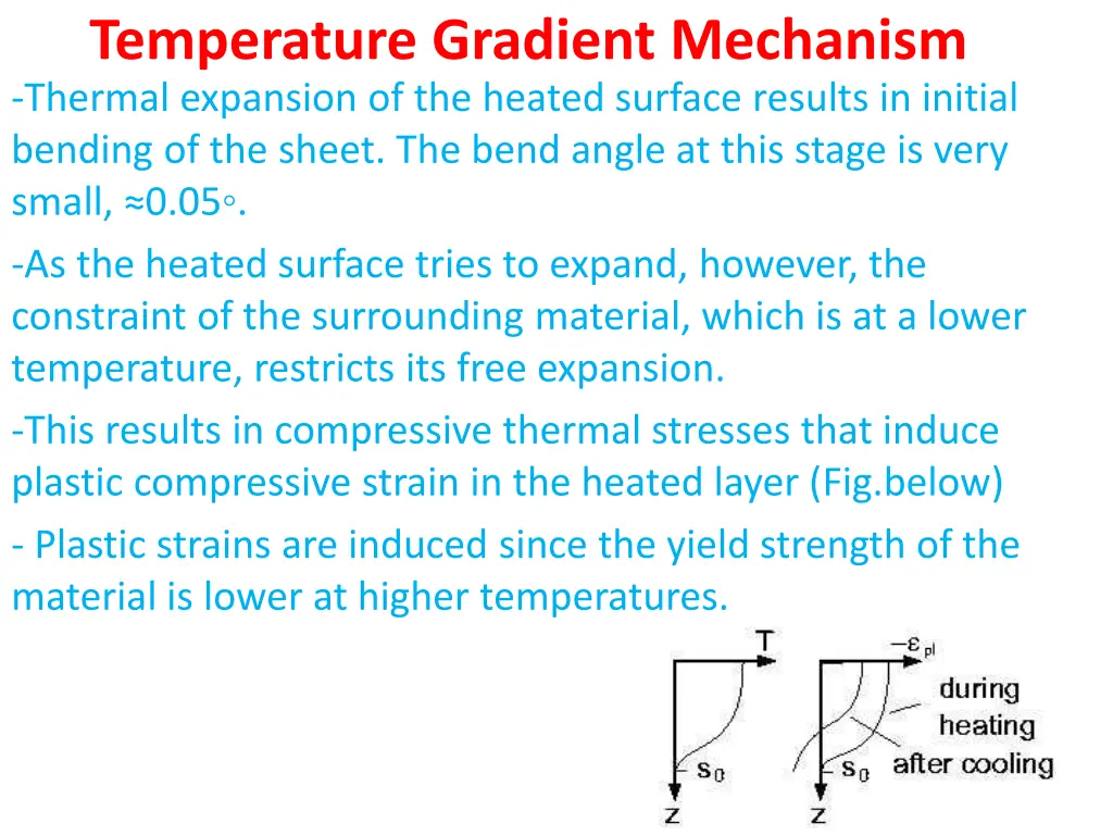 Temperature Gradient Mechanism -Thermal expansion of the heated surface results in initial bending of the sheet. The bend angle at this stage is very small, 0.05 . -As the heated surface tries to expand, however, the constraint of the surrounding material, which is at a lower temperature, restricts its free expansion. -This results in compressive thermal stresses that induce plastic compressive strain in the heated layer (Fig.below) - Plastic strains are induced since the yield strength of the material is lower at higher temperatures.