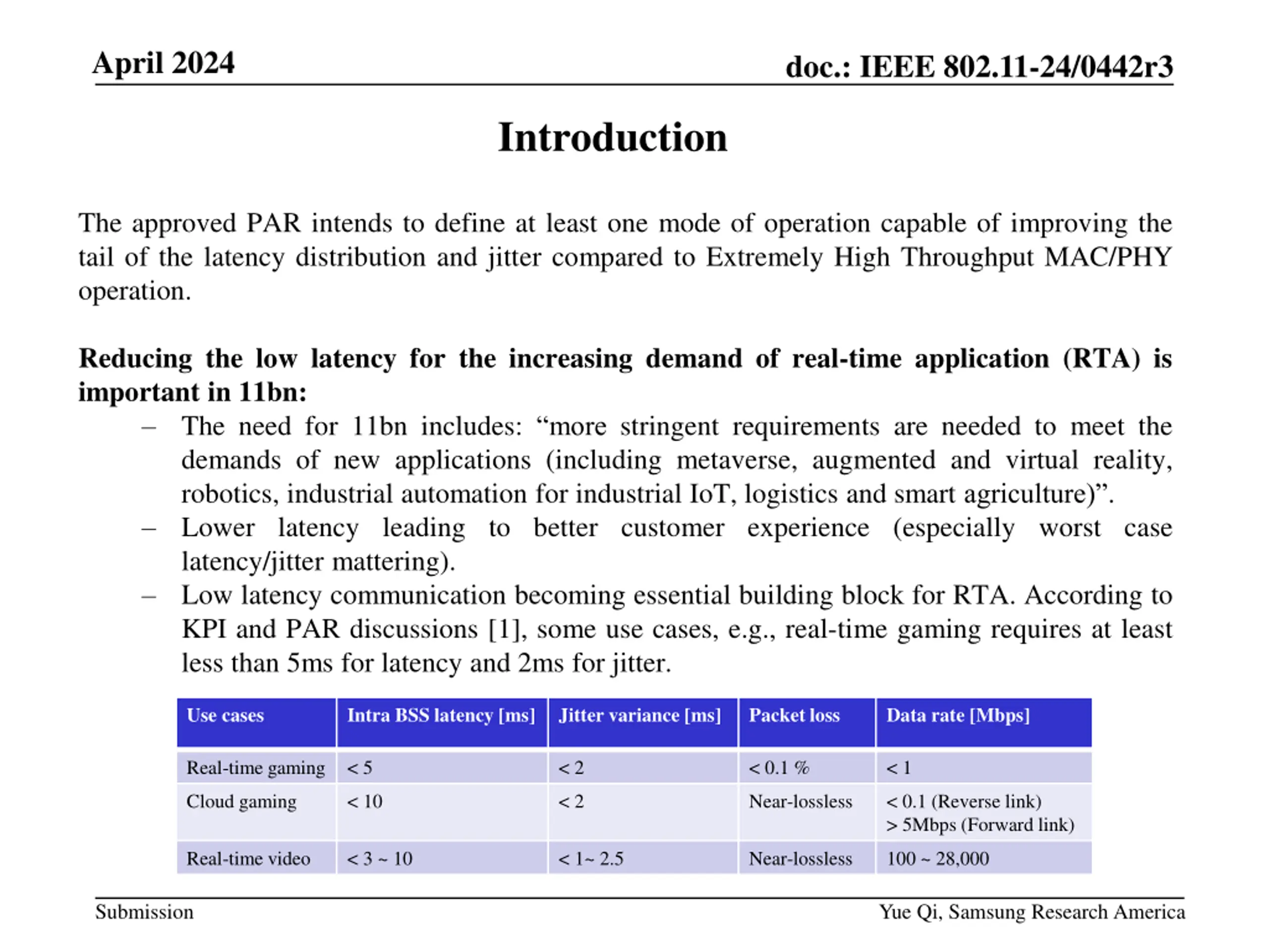 April 2024 doc.: IEEE 802.11-24/0442r3 Introduction The approved PAR intends to define at least one mode of operation capable of improving the tail of the latency distribution and jitter compared to Extremely High Throughput MAC/PHY operation. Reducing the low latency for the increasing demand of real-time application (RTA) is important in 11bn: The need for 11bn includes: more stringent requirements are needed to meet the demands of new applications (including metaverse, augmented and virtual reality, robotics, industrial automation for industrial IoT, logistics and smart agriculture) . Lower latency leading to better customer experience (especially worst case latency/jitter mattering). Low latency communication becoming essential building block for RTA. According to KPI and PAR discussions [1], some use cases, e.g., real-time gaming requires at least less than 5ms for latency and 2ms for jitter. Use cases Intra BSS latency [ms] Jitter variance [ms] Packet loss Data rate [Mbps] Real-time gaming < 5 < 2 < 0.1 % < 1 Cloud gaming < 10 < 2 Near-lossless < 0.1 (Reverse link) > 5Mbps (Forward link) Real-time video < 3 ~ 10 < 1~ 2.5 Near-lossless 100 ~ 28,000 Submission Yue Qi, Samsung Research America
