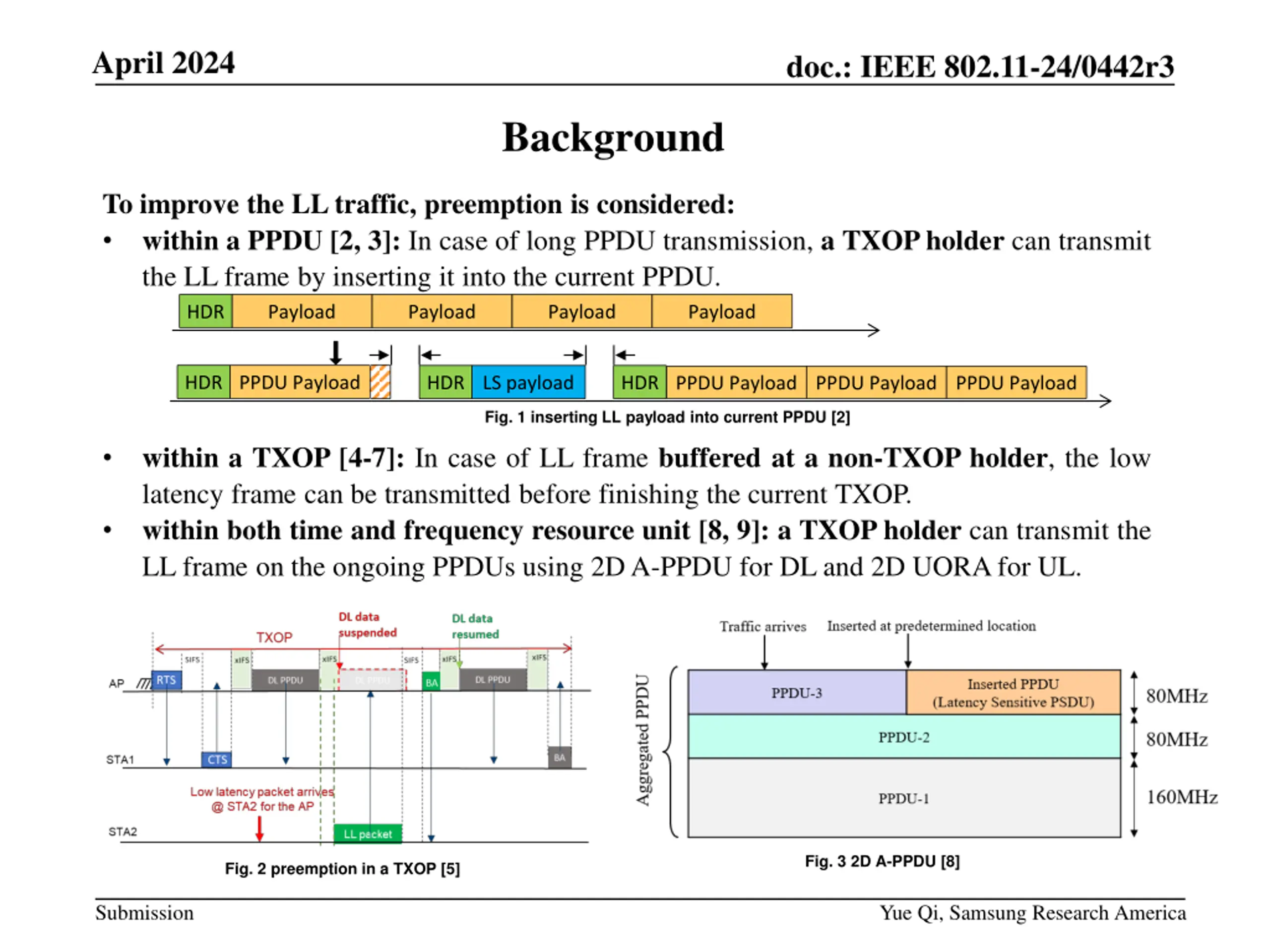 April 2024 doc.: IEEE 802.11-24/0442r3 Background To improve the LL traffic, preemption is considered: within a PPDU [2, 3]: In case of long PPDU transmission, a TXOP holder can transmit the LL frame by inserting it into the current PPDU. HDR Payload Payload Payload Payload HDR PPDU Payload HDR LS payload HDR PPDU Payload PPDU Payload PPDU Payload Fig. 1 inserting LL payload into current PPDU [2] within a TXOP [4-7]: In case of LL frame buffered at a non-TXOP holder, the low latency frame can be transmitted before finishing the current TXOP. within both time and frequency resource unit [8, 9]: a TXOP holder can transmit the LL frame on the ongoing PPDUs using 2D A-PPDU for DL and 2D UORA for UL. Fig. 3 2D A-PPDU [8] Fig. 2 preemption in a TXOP [5] Submission Yue Qi, Samsung Research America