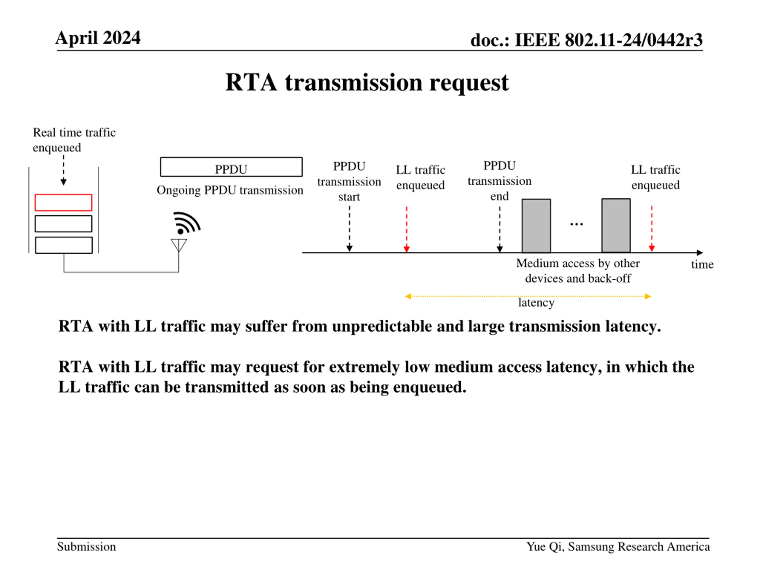 April 2024 doc.: IEEE 802.11-24/0442r3 RTA transmission request Real time traffic enqueued PPDU transmission end PPDU transmission start PPDU LL traffic enqueued LL traffic enqueued Ongoing PPDU transmission Medium access by other devices and back-off time latency RTA with LL traffic may suffer from unpredictable and large transmission latency. RTA with LL traffic may request for extremely low medium access latency, in which the LL traffic can be transmitted as soon as being enqueued. Submission Yue Qi, Samsung Research America