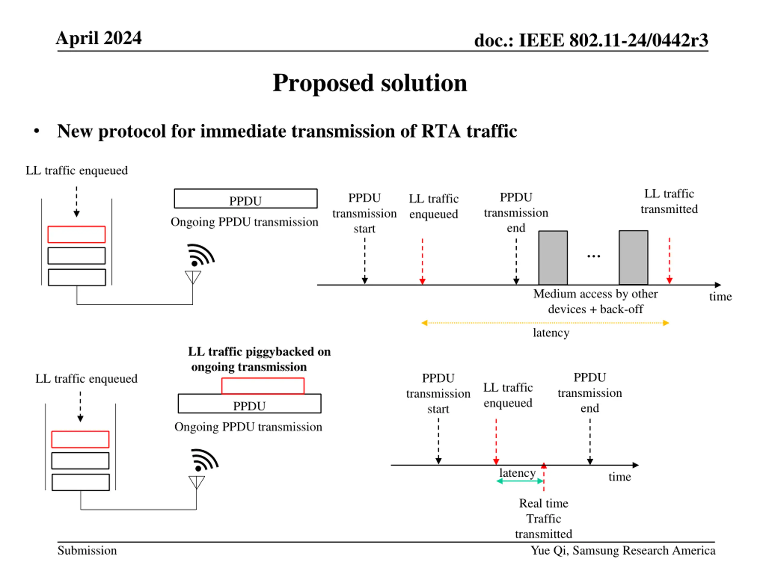 April 2024 doc.: IEEE 802.11-24/0442r3 Proposed solution New protocol for immediate transmission of RTA traffic LL traffic enqueued LL traffic transmitted PPDU transmission end PPDU transmission start LL traffic enqueued PPDU Ongoing PPDU transmission Medium access by other devices + back-off time latency LL traffic piggybacked on ongoing transmission PPDU transmission end PPDU transmission start LL traffic enqueued LL traffic enqueued PPDU Ongoing PPDU transmission latency time Real time Traffic transmitted Yue Qi, Samsung Research America Submission