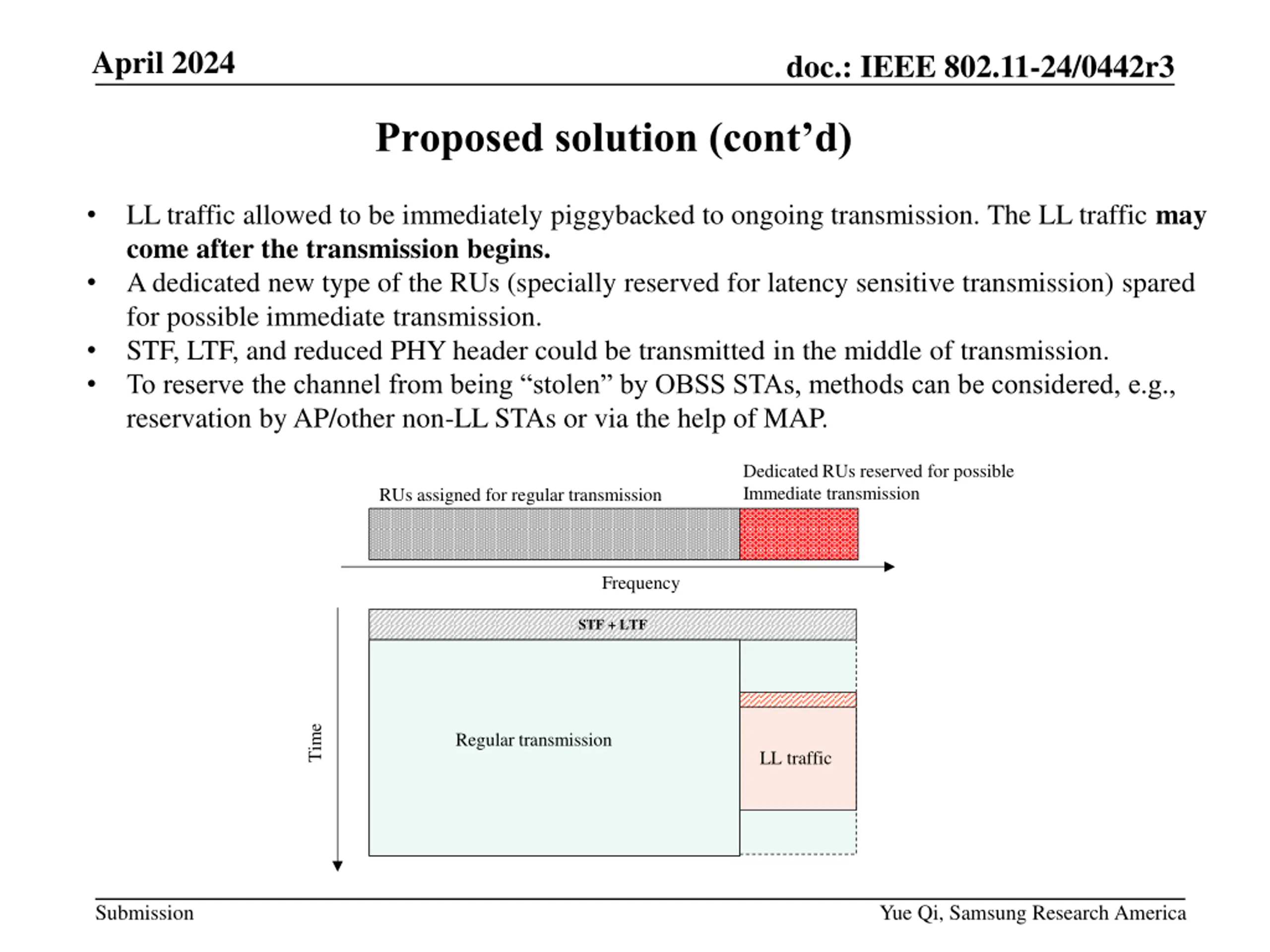 April 2024 doc.: IEEE 802.11-24/0442r3 Proposed solution (cont d) LL traffic allowed to be immediately piggybacked to ongoing transmission. The LL traffic may come after the transmission begins. A dedicated new type of the RUs (specially reserved for latency sensitive transmission) spared for possible immediate transmission. STF, LTF, and reduced PHY header could be transmitted in the middle of transmission. To reserve the channel from being stolen by OBSS STAs, methods can be considered, e.g., reservation by AP/other non-LL STAs or via the help of MAP. Dedicated RUs reserved for possible Immediate transmission RUs assigned for regular transmission Frequency STF + LTF Time Regular transmission LL traffic Submission Yue Qi, Samsung Research America