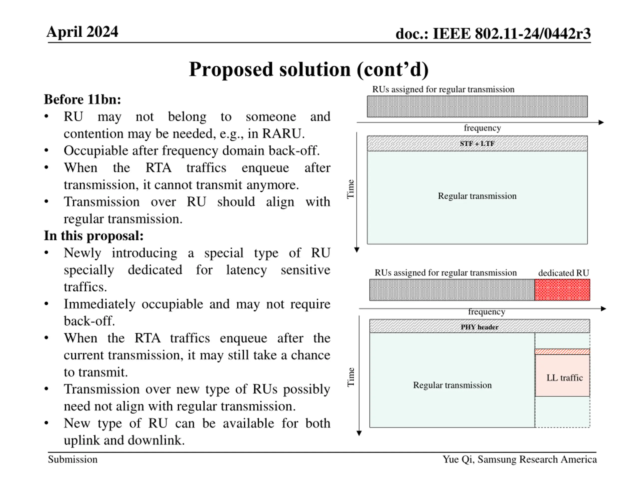 April 2024 doc.: IEEE 802.11-24/0442r3 Proposed solution (cont d) RUs assigned for regular transmission Before 11bn: RU may not belong to someone and contention may be needed, e.g., in RARU. Occupiable after frequency domain back-off. When the RTA traffics enqueue after transmission, it cannot transmit anymore. Transmission over RU should align with regular transmission. In this proposal: Newly introducing a special type of RU specially dedicated for latency sensitive traffics. Immediately occupiable and may not require back-off. When the RTA traffics enqueue after the current transmission, it may still take a chance to transmit. Transmission over new type of RUs possibly need not align with regular transmission. New type of RU can be available for both uplink and downlink. frequency STF + LTF Time Regular transmission RUs assigned for regular transmission dedicated RU frequency PHY header Time LL traffic Regular transmission Submission Yue Qi, Samsung Research America