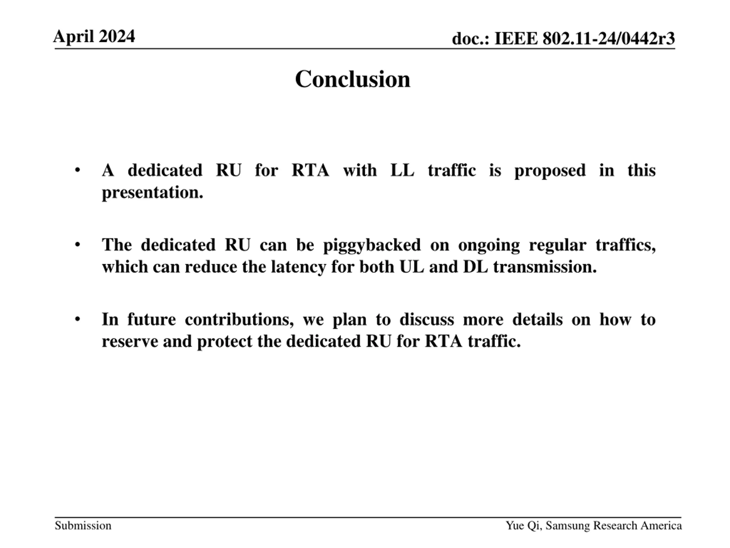 April 2024 doc.: IEEE 802.11-24/0442r3 Conclusion A dedicated RU for RTA with LL traffic is proposed in this presentation. The dedicated RU can be piggybacked on ongoing regular traffics, which can reduce the latency for both UL and DL transmission. In future contributions, we plan to discuss more details on how to reserve and protect the dedicated RU for RTA traffic. Submission Yue Qi, Samsung Research America