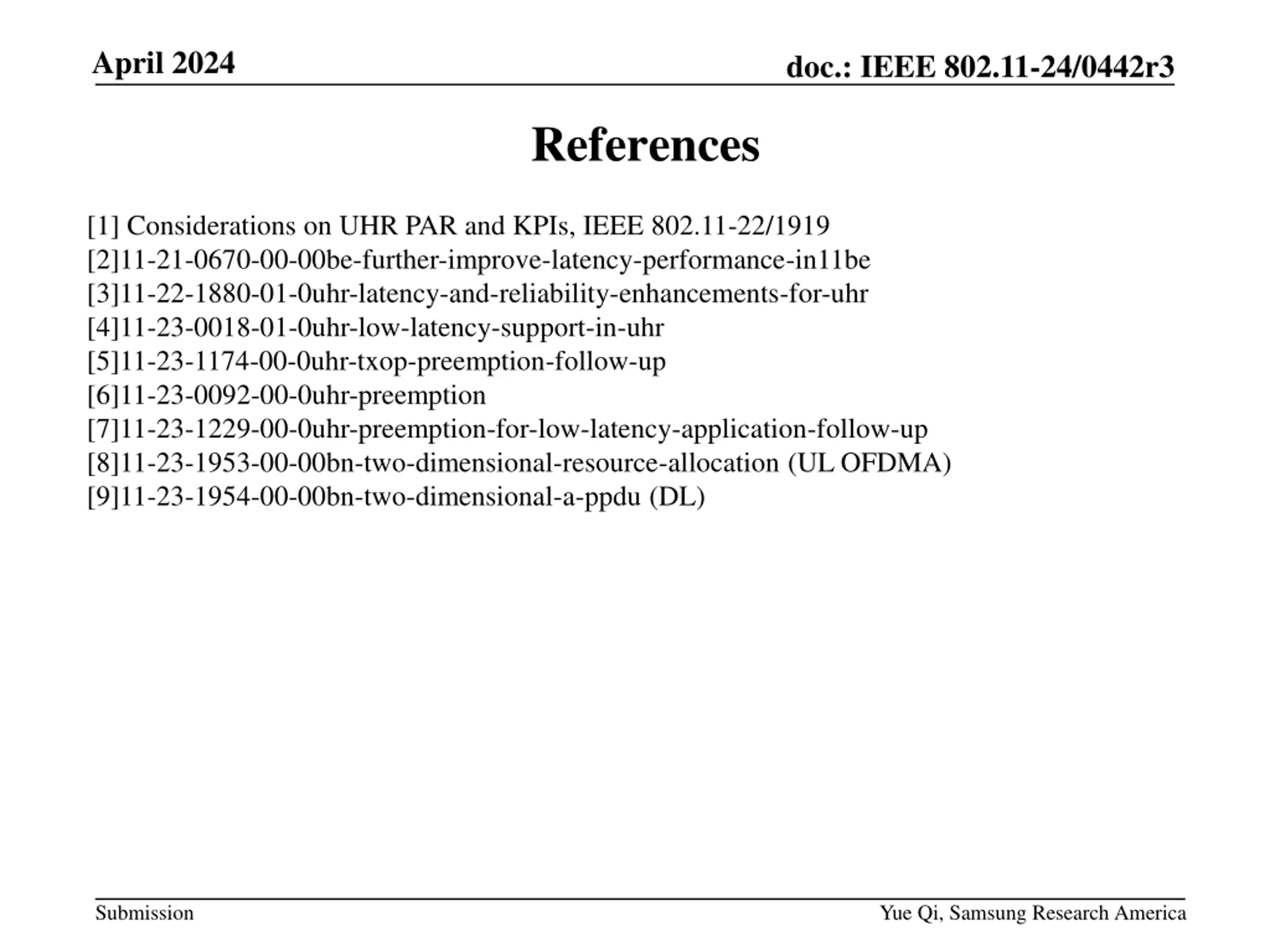 April 2024 doc.: IEEE 802.11-24/0442r3 References [1] Considerations on UHR PAR and KPIs, IEEE 802.11-22/1919 [2]11-21-0670-00-00be-further-improve-latency-performance-in11be [3]11-22-1880-01-0uhr-latency-and-reliability-enhancements-for-uhr [4]11-23-0018-01-0uhr-low-latency-support-in-uhr [5]11-23-1174-00-0uhr-txop-preemption-follow-up [6]11-23-0092-00-0uhr-preemption [7]11-23-1229-00-0uhr-preemption-for-low-latency-application-follow-up [8]11-23-1953-00-00bn-two-dimensional-resource-allocation (UL OFDMA) [9]11-23-1954-00-00bn-two-dimensional-a-ppdu (DL) Submission Yue Qi, Samsung Research America
