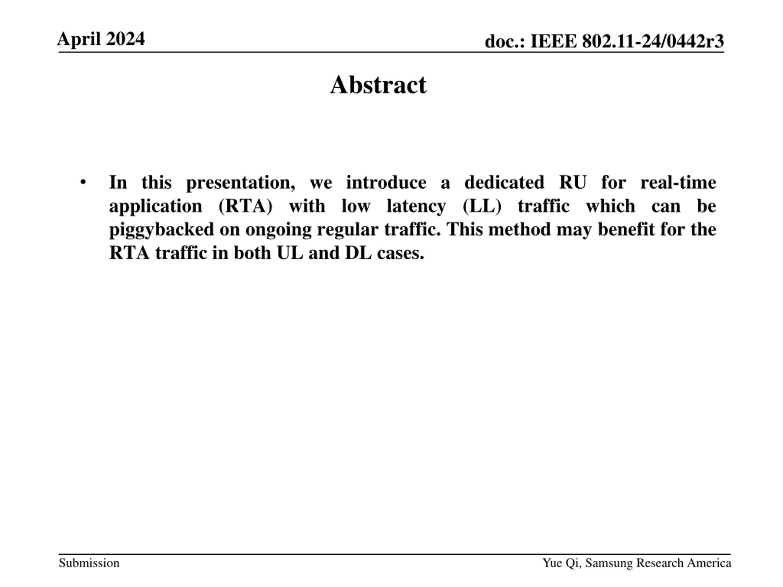 April 2024 doc.: IEEE 802.11-24/0442r3 Abstract In this presentation, we introduce a dedicated RU for real-time application (RTA) with low latency (LL) traffic which can be piggybacked on ongoing regular traffic. This method may benefit for the RTA traffic in both UL and DL cases. Submission Yue Qi, Samsung Research America