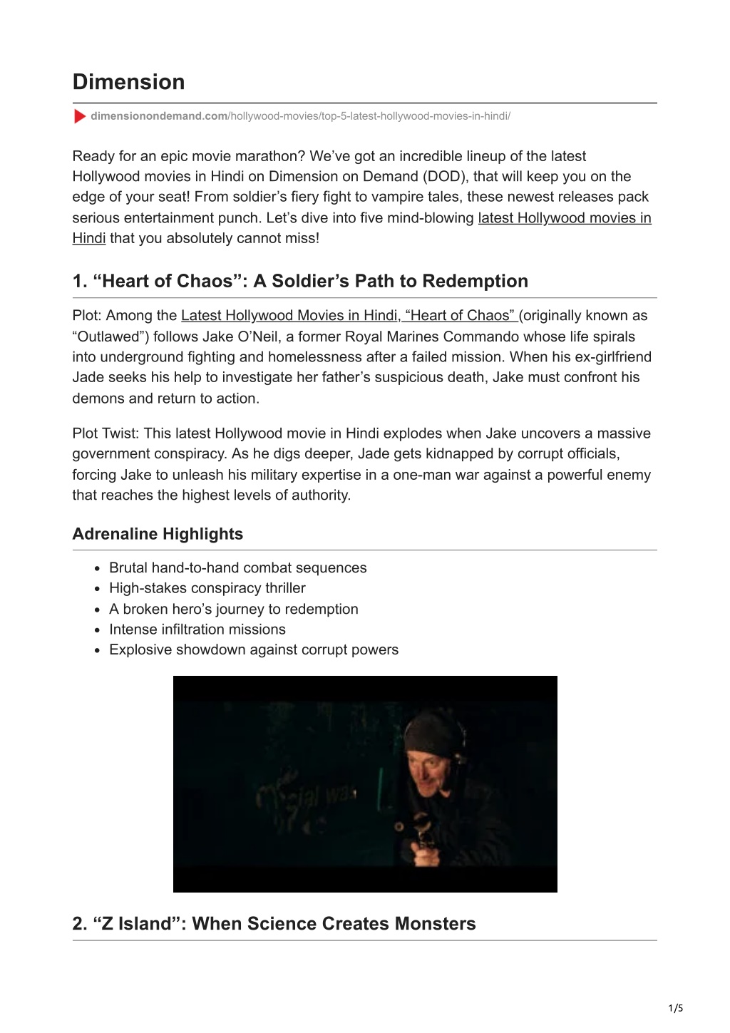 Dimension dimensionondemand.com/hollywood-movies/top-5-latest-hollywood-movies-in-hindi/ Ready for an epic movie marathon? We ve got an incredible lineup of the latest Hollywood movies in Hindi on Dimension on Demand (DOD), that will keep you on the edge of your seat! From soldier s fiery fight to vampire tales, these newest releases pack serious entertainment punch. Let s dive into five mind-blowing latest Hollywood movies in Hindi that you absolutely cannot miss! 1. Heart of Chaos : A Soldier s Path to Redemption Plot: Among the Latest Hollywood Movies in Hindi, Heart of Chaos (originally known as Outlawed ) follows Jake O Neil, a former Royal Marines Commando whose life spirals into underground fighting and homelessness after a failed mission. When his ex-girlfriend Jade seeks his help to investigate her father s suspicious death, Jake must confront his demons and return to action. Plot Twist: This latest Hollywood movie in Hindi explodes when Jake uncovers a massive government conspiracy. As he digs deeper, Jade gets kidnapped by corrupt officials, forcing Jake to unleash his military expertise in a one-man war against a powerful enemy that reaches the highest levels of authority. Adrenaline Highlights Brutal hand-to-hand combat sequences High-stakes conspiracy thriller A broken hero s journey to redemption Intense infiltration missions Explosive showdown against corrupt powers 2. Z Island : When Science Creates Monsters 1/5