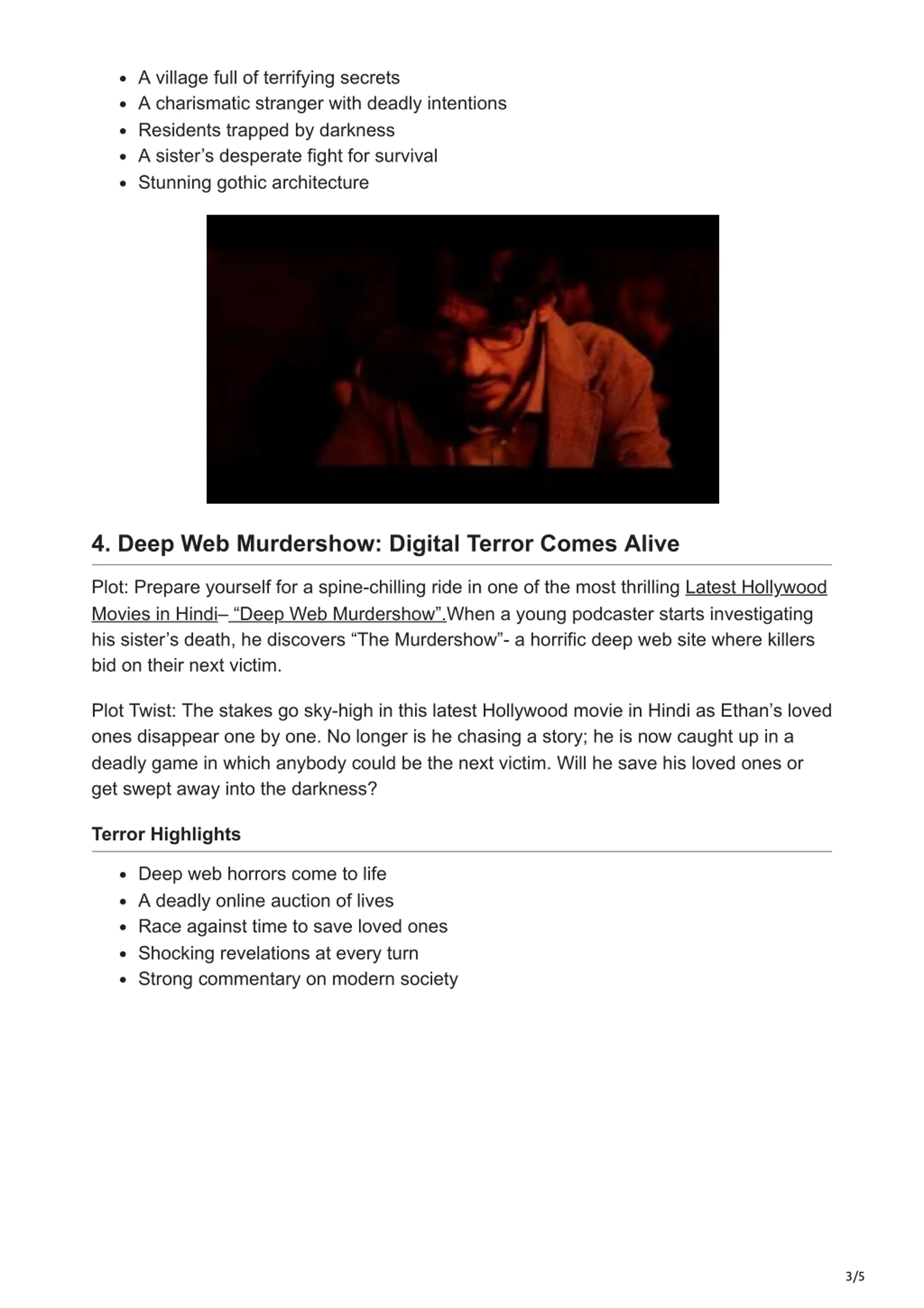 A village full of terrifying secrets A charismatic stranger with deadly intentions Residents trapped by darkness A sister s desperate fight for survival Stunning gothic architecture 4. Deep Web Murdershow: Digital Terror Comes Alive Plot: Prepare yourself for a spine-chilling ride in one of the most thrilling Latest Hollywood Movies in Hindi Deep Web Murdershow .When a young podcaster starts investigating his sister s death, he discovers The Murdershow - a horrific deep web site where killers bid on their next victim. Plot Twist: The stakes go sky-high in this latest Hollywood movie in Hindi as Ethan s loved ones disappear one by one. No longer is he chasing a story; he is now caught up in a deadly game in which anybody could be the next victim. Will he save his loved ones or get swept away into the darkness? Terror Highlights Deep web horrors come to life A deadly online auction of lives Race against time to save loved ones Shocking revelations at every turn Strong commentary on modern society 3/5