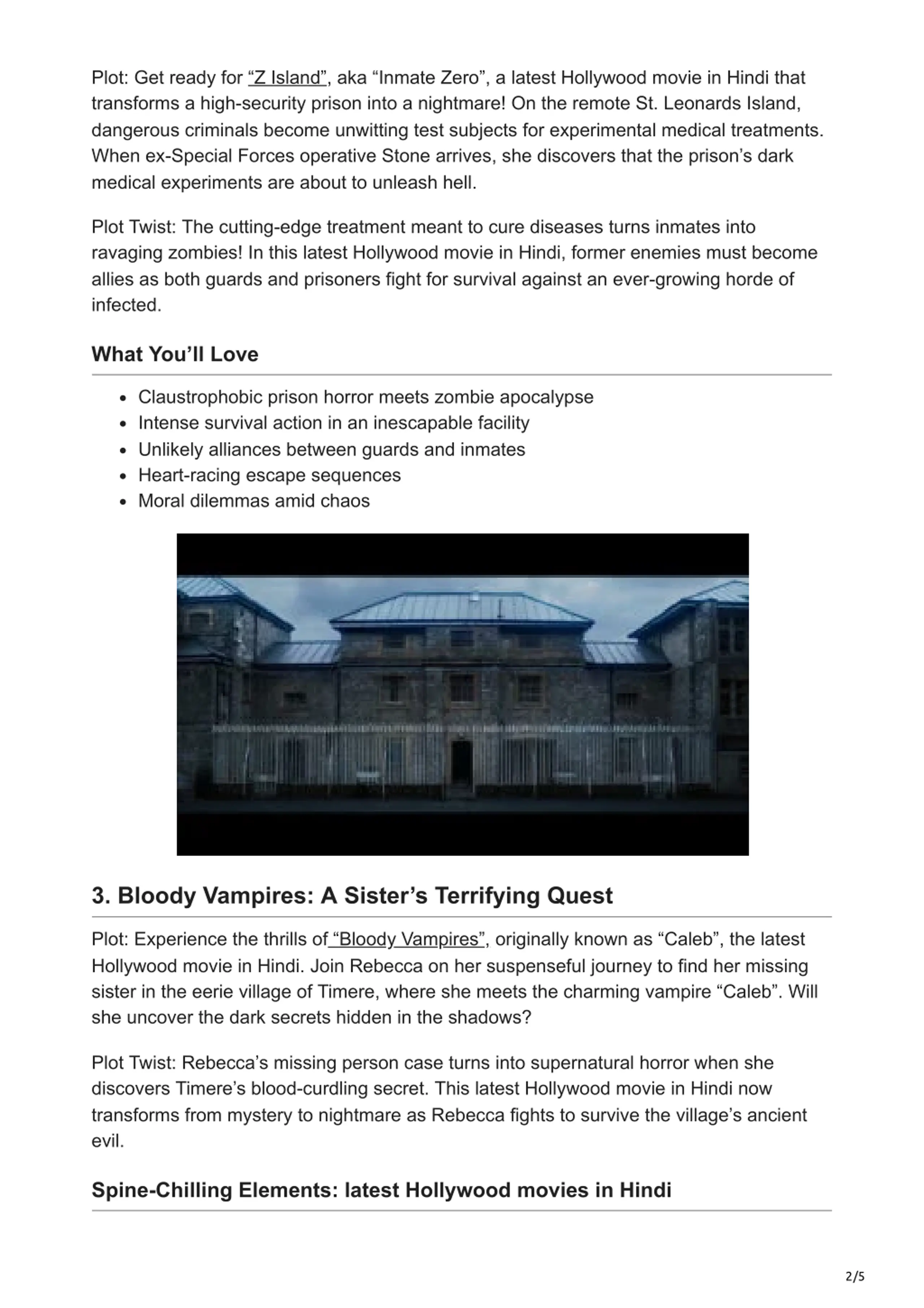 Plot: Get ready for Z Island, aka Inmate Zero, a latest Hollywood movie in Hindi that transforms a high-security prison into a nightmare! On the remote St. Leonards Island, dangerous criminals become unwitting test subjects for experimental medical treatments. When ex-Special Forces operative Stone arrives, she discovers that the prison s dark medical experiments are about to unleash hell. Plot Twist: The cutting-edge treatment meant to cure diseases turns inmates into ravaging zombies! In this latest Hollywood movie in Hindi, former enemies must become allies as both guards and prisoners fight for survival against an ever-growing horde of infected. What You ll Love Claustrophobic prison horror meets zombie apocalypse Intense survival action in an inescapable facility Unlikely alliances between guards and inmates Heart-racing escape sequences Moral dilemmas amid chaos 3. Bloody Vampires: A Sister s Terrifying Quest Plot: Experience the thrills of Bloody Vampires , originally known as Caleb , the latest Hollywood movie in Hindi. Join Rebecca on her suspenseful journey to find her missing sister in the eerie village of Timere, where she meets the charming vampire Caleb . Will she uncover the dark secrets hidden in the shadows? Plot Twist: Rebecca s missing person case turns into supernatural horror when she discovers Timere s blood-curdling secret. This latest Hollywood movie in Hindi now transforms from mystery to nightmare as Rebecca fights to survive the village s ancient evil. Spine-Chilling Elements: latest Hollywood movies in Hindi 2/5