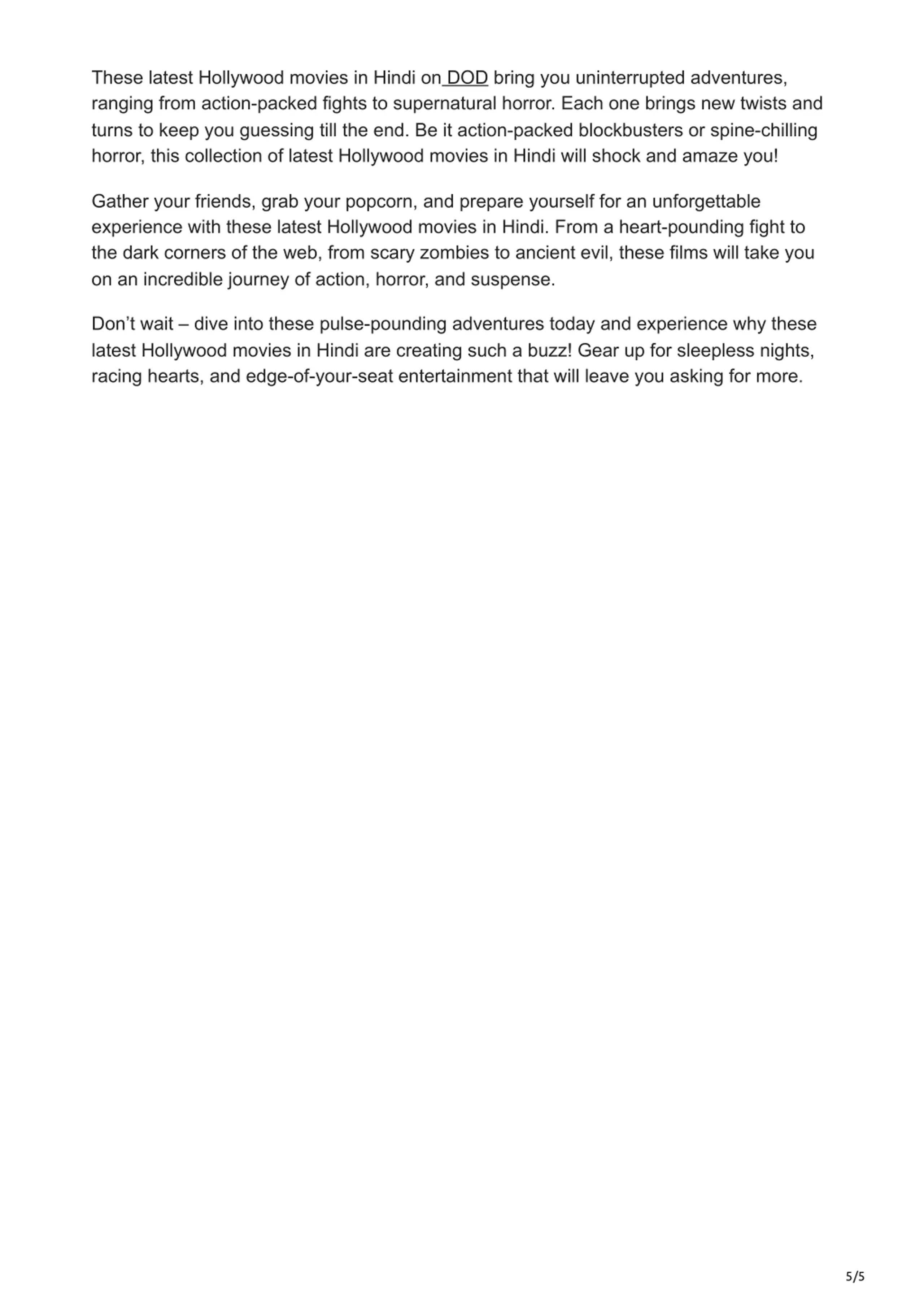 These latest Hollywood movies in Hindi on DOD bring you uninterrupted adventures, ranging from action-packed fights to supernatural horror. Each one brings new twists and turns to keep you guessing till the end. Be it action-packed blockbusters or spine-chilling horror, this collection of latest Hollywood movies in Hindi will shock and amaze you! Gather your friends, grab your popcorn, and prepare yourself for an unforgettable experience with these latest Hollywood movies in Hindi. From a heart-pounding fight to the dark corners of the web, from scary zombies to ancient evil, these films will take you on an incredible journey of action, horror, and suspense. Don t wait dive into these pulse-pounding adventures today and experience why these latest Hollywood movies in Hindi are creating such a buzz! Gear up for sleepless nights, racing hearts, and edge-of-your-seat entertainment that will leave you asking for more. 5/5