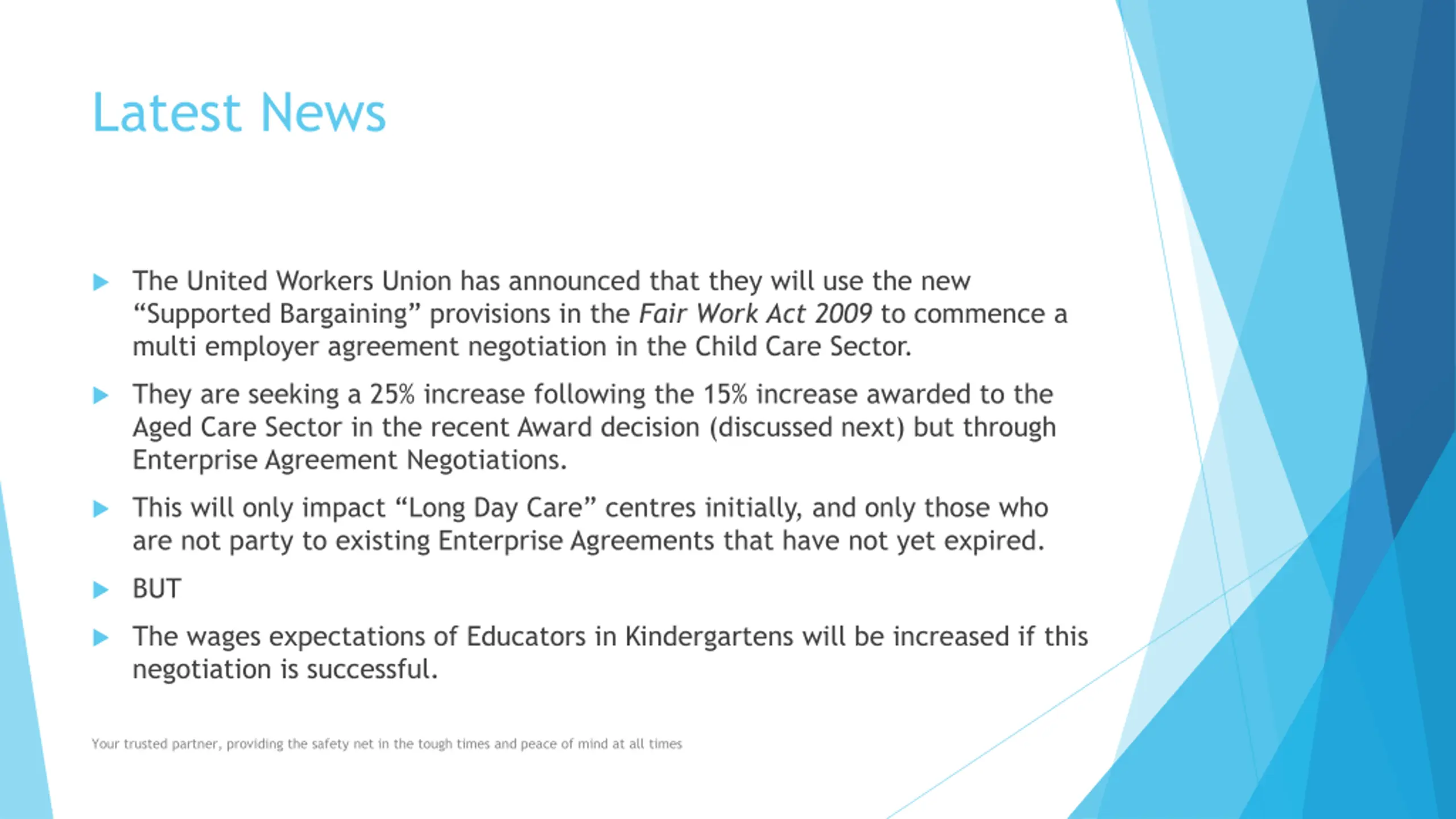 Latest News The United Workers Union has announced that they will use the new Supported Bargaining provisions in the Fair Work Act 2009 to commence a multi employer agreement negotiation in the Child Care Sector. They are seeking a 25% increase following the 15% increase awarded to the Aged Care Sector in the recent Award decision (discussed next) but through Enterprise Agreement Negotiations. This will only impact Long Day Care centres initially, and only those who are not party to existing Enterprise Agreements that have not yet expired. BUT The wages expectations of Educators in Kindergartens will be increased if this negotiation is successful. Your trusted partner, providing the safety net in the tough times and peace of mind at all times