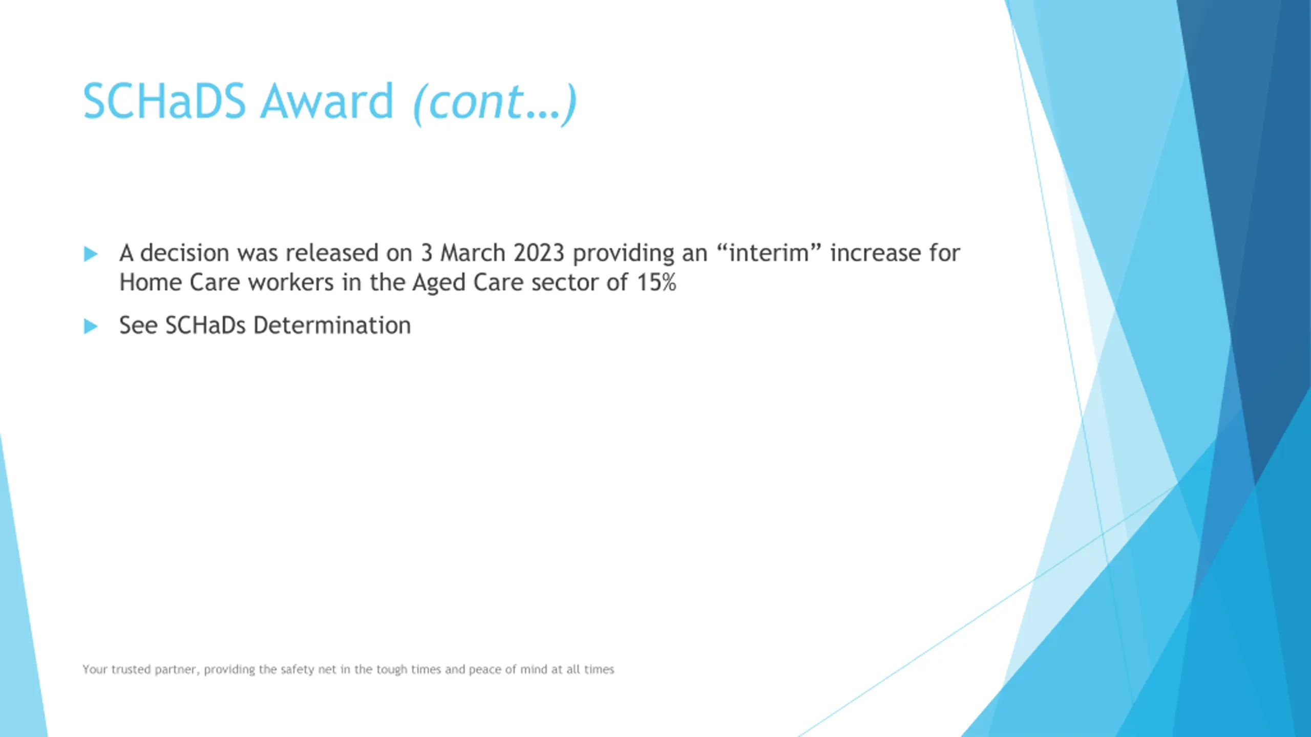 SCHaDS Award (cont) A decision was released on 3 March 2023 providing an interim increase for Home Care workers in the Aged Care sector of 15% See SCHaDs Determination Your trusted partner, providing the safety net in the tough times and peace of mind at all times