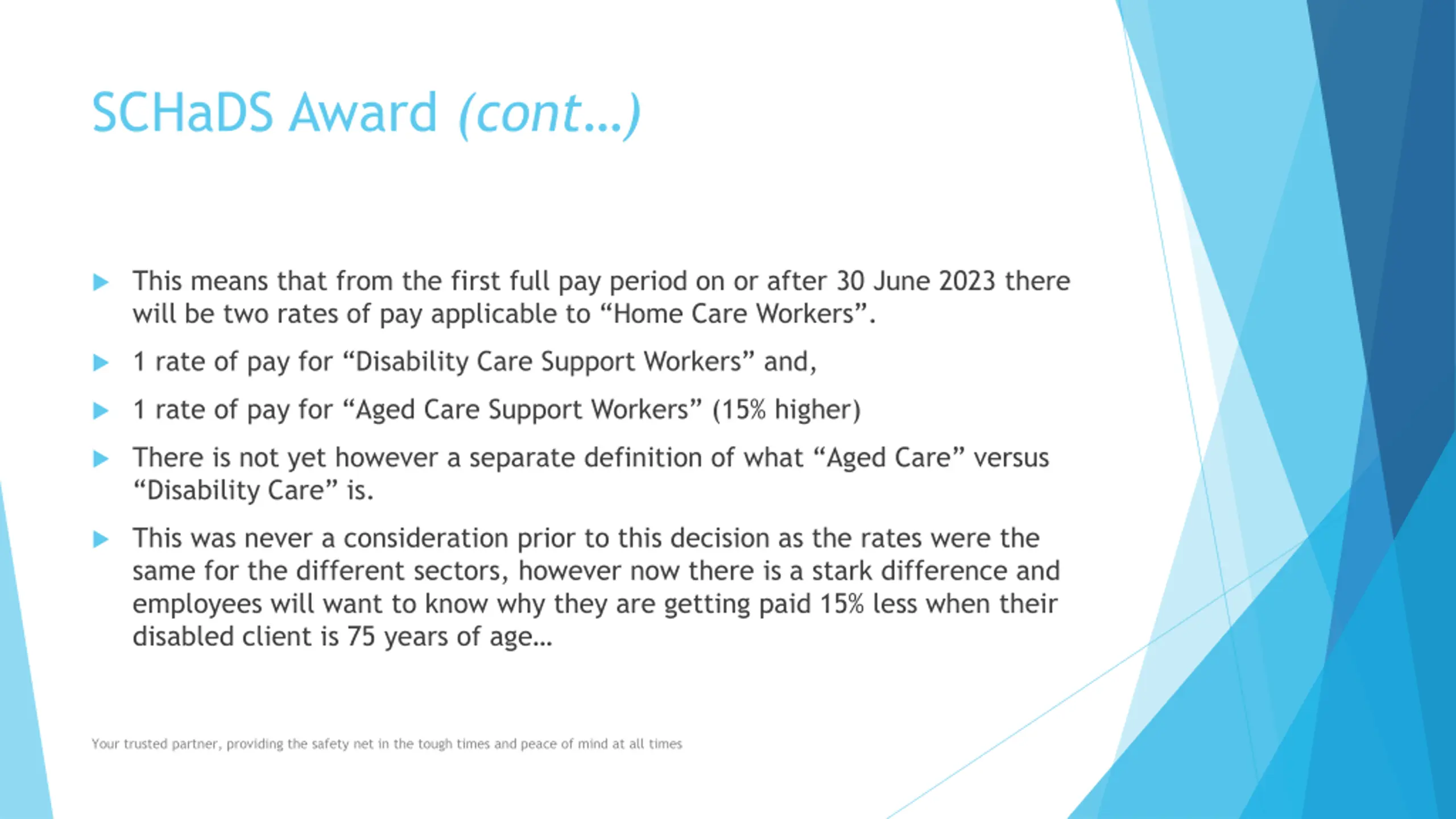 SCHaDS Award (cont) This means that from the first full pay period on or after 30 June 2023 there will be two rates of pay applicable to Home Care Workers . 1 rate of pay for Disability Care Support Workers and, 1 rate of pay for Aged Care Support Workers (15% higher) There is not yet however a separate definition of what Aged Care versus Disability Care is. This was never a consideration prior to this decision as the rates were the same for the different sectors, however now there is a stark difference and employees will want to know why they are getting paid 15% less when their disabled client is 75 years of age Your trusted partner, providing the safety net in the tough times and peace of mind at all times