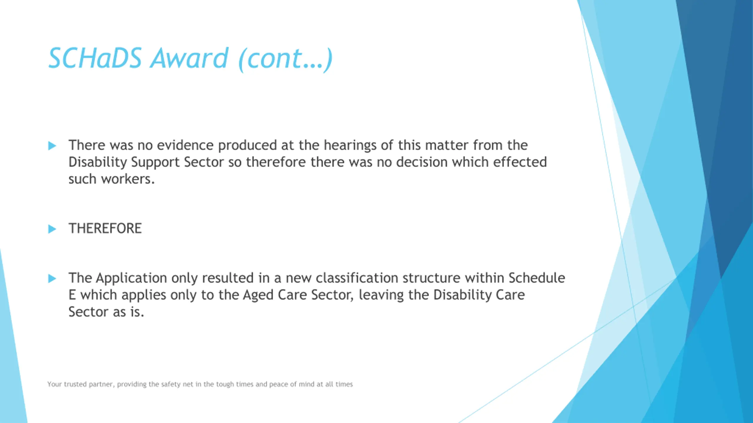 SCHaDS Award (cont) There was no evidence produced at the hearings of this matter from the Disability Support Sector so therefore there was no decision which effected such workers. THEREFORE The Application only resulted in a new classification structure within Schedule E which applies only to the Aged Care Sector, leaving the Disability Care Sector as is. Your trusted partner, providing the safety net in the tough times and peace of mind at all times