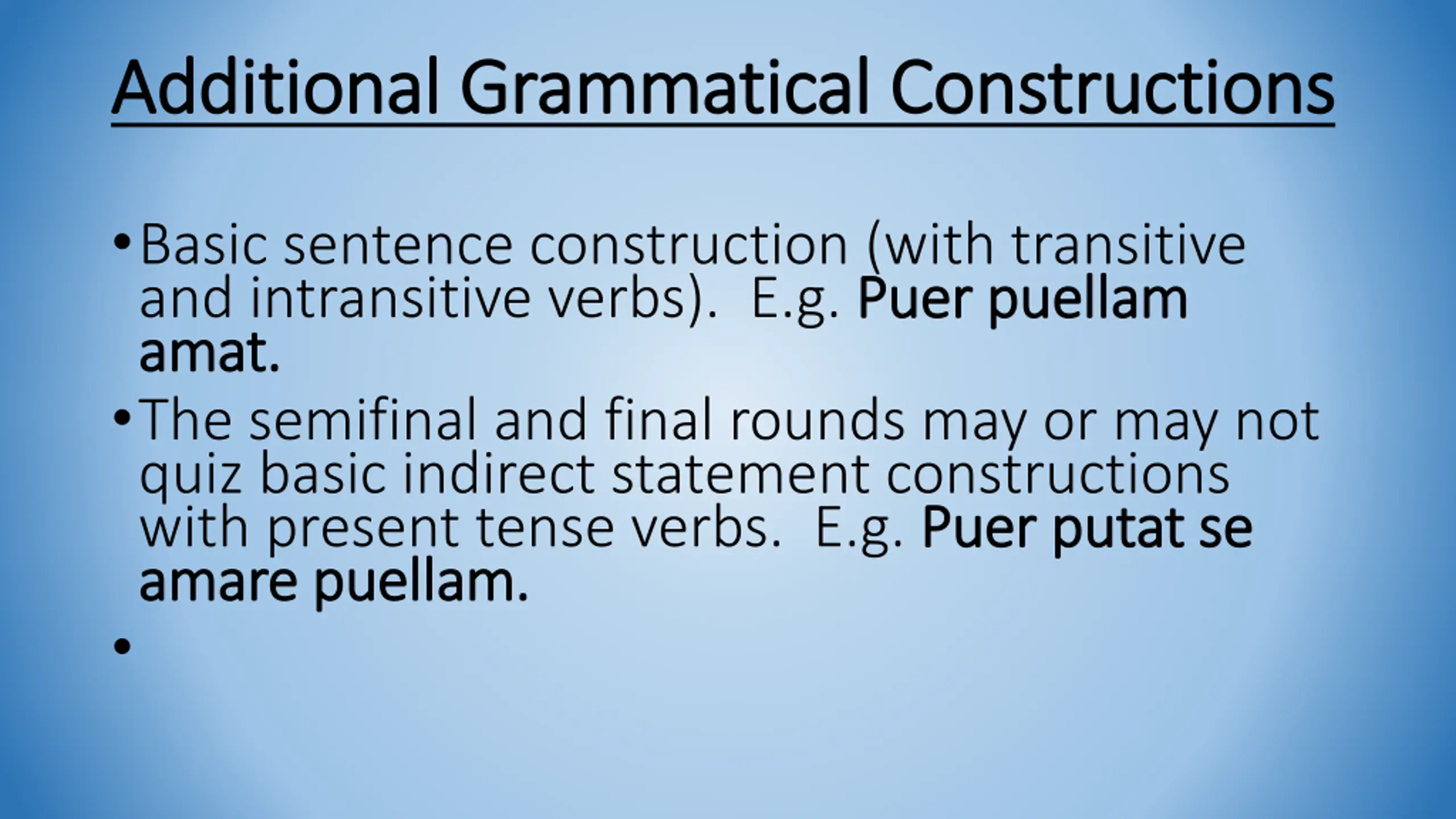 Additional Grammatical Constructions Additional Grammatical Constructions Basic sentence construction (with transitive and intransitive verbs). E.g. Puer amat amat. . The semifinal and final rounds may or may not quiz basic indirect statement constructions with present tense verbs. E.g. Puer amare amare puellam puellam. . Puer puellam puellam Puer putat putat se se