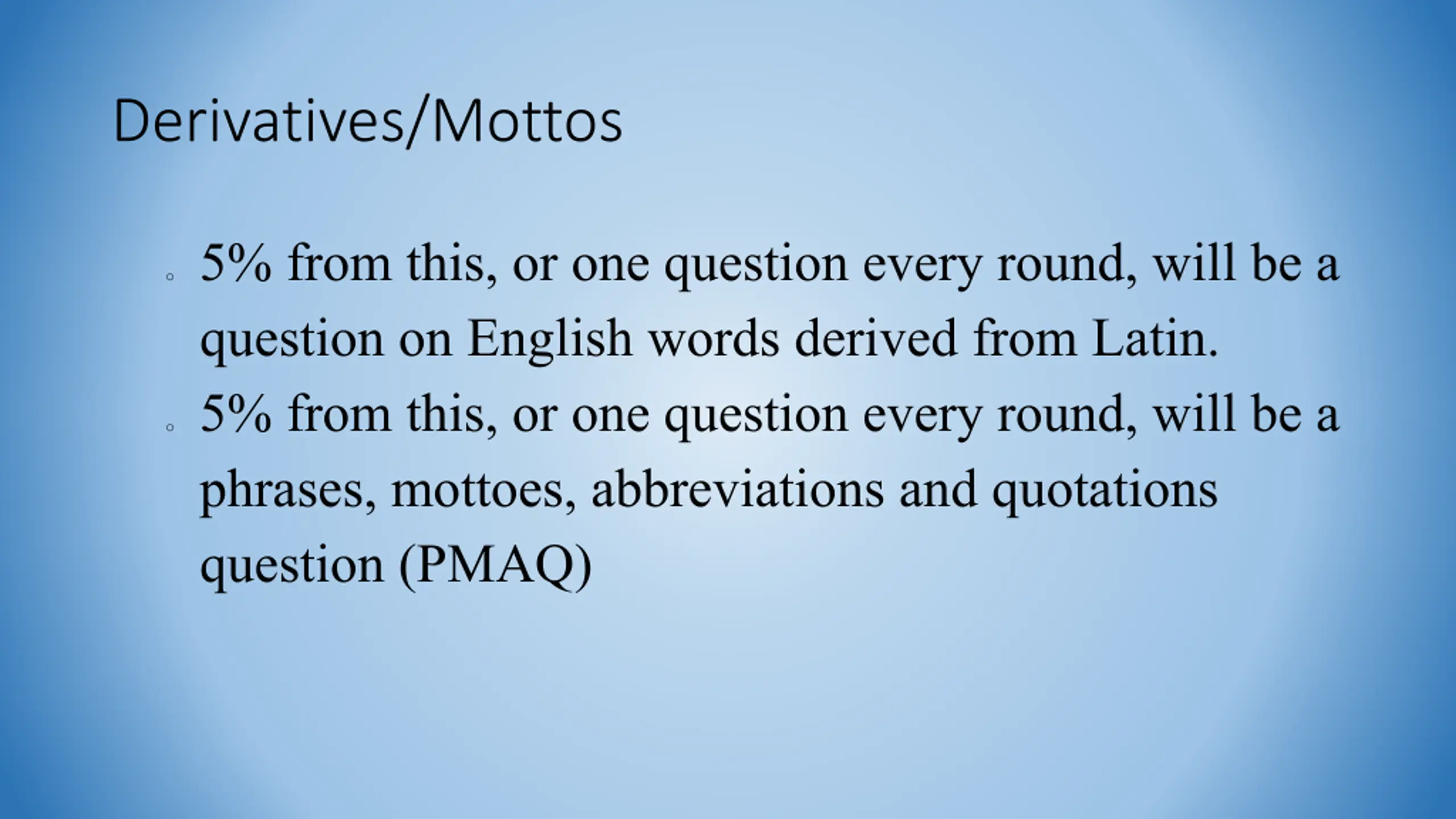 Derivatives/Mottos o 5% from this, or one question every round, will be a question on English words derived from Latin. o 5% from this, or one question every round, will be a phrases, mottoes, abbreviations and quotations question (PMAQ)