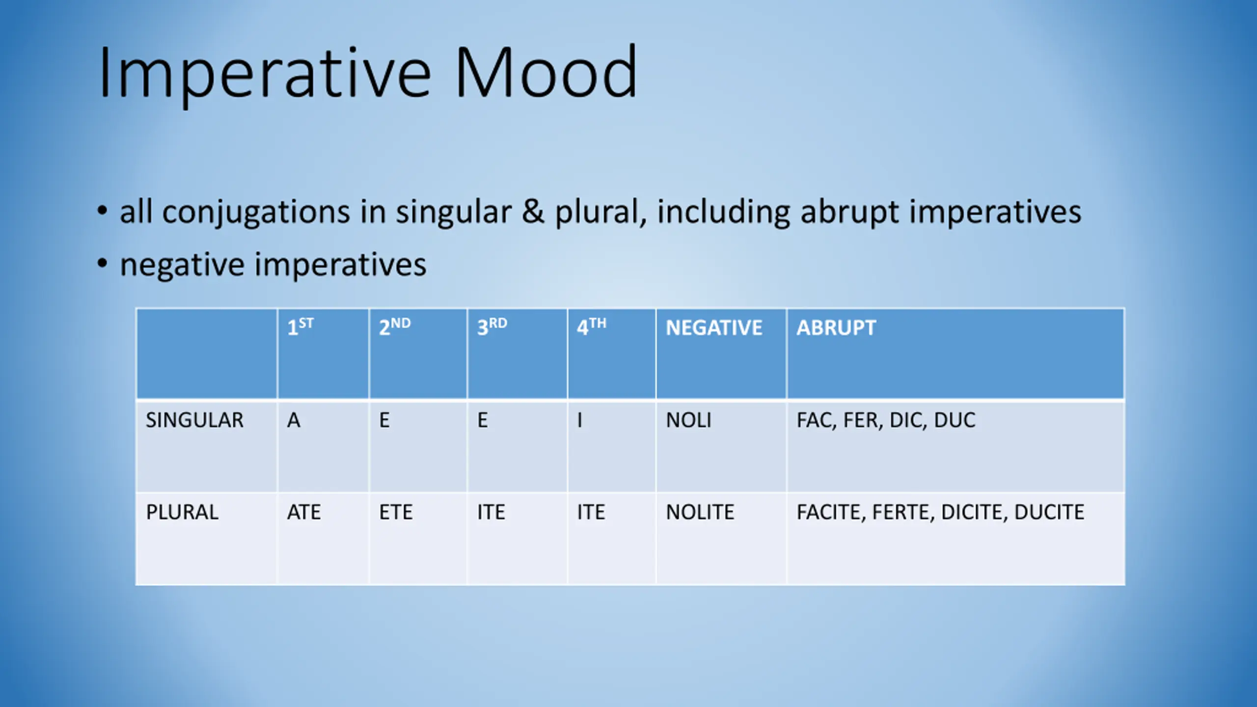 Imperative Mood all conjugations in singular & plural, including abrupt imperatives negative imperatives 1ST 2ND 3RD 4TH NEGATIVE ABRUPT SINGULAR A E E I NOLI FAC, FER, DIC, DUC PLURAL ATE ETE ITE ITE NOLITE FACITE, FERTE, DICITE, DUCITE